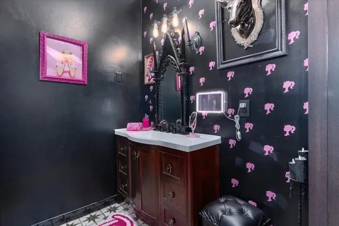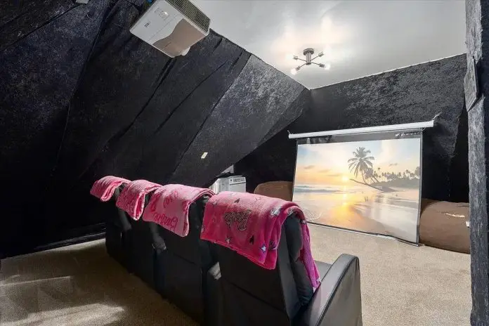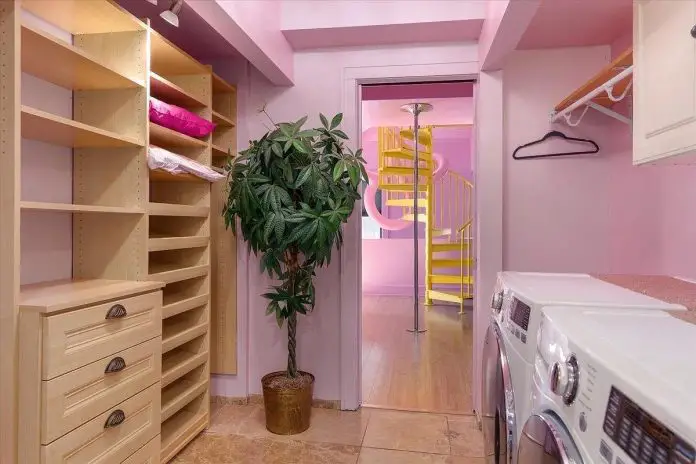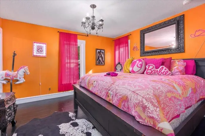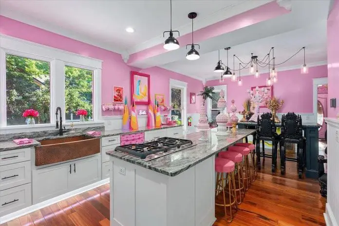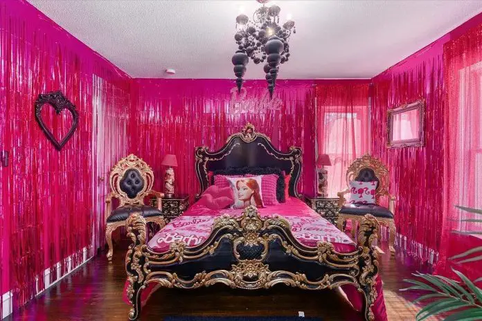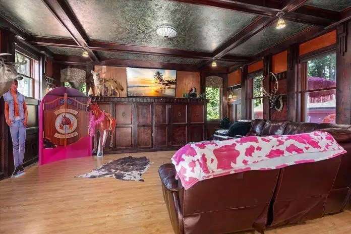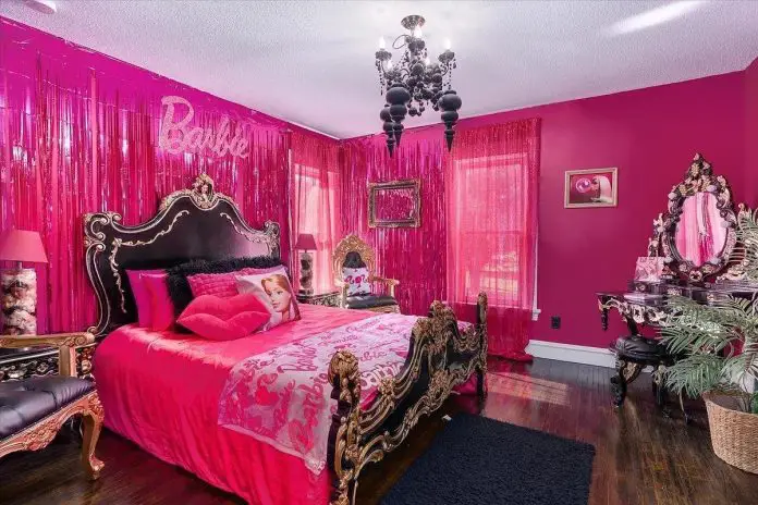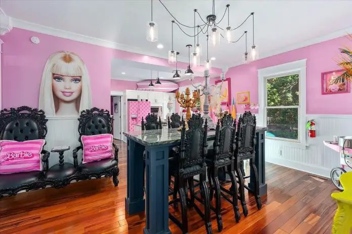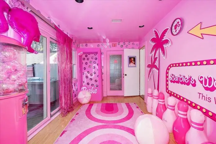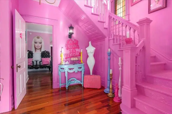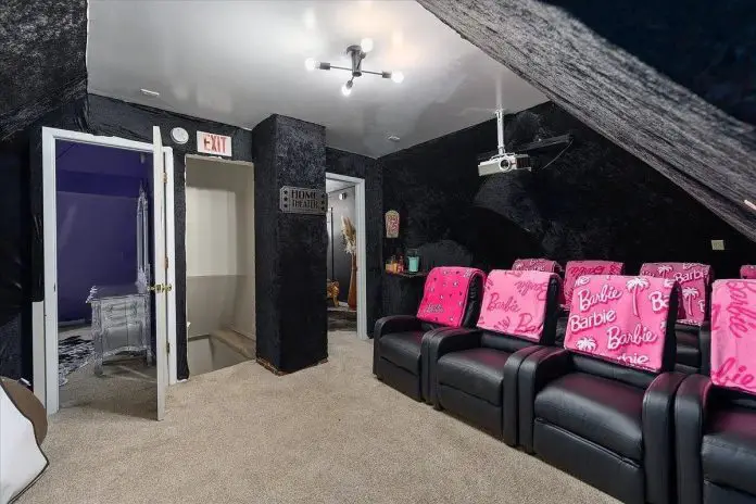The second floor features four generous bedrooms, while the third floor offers three additional bedrooms and a dedicated movie room—perfect for big-screen Barbie nights.