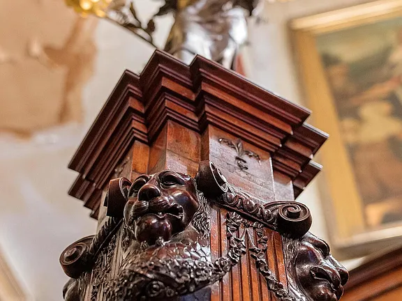 At the heart of the home lies the awe-inspiring Grand Hall, a space designed to impress and welcome. The hall is anchored by an ornate staircase of remarkable detail. Its newell posts feature sculpted lion heads—exquisite, expressive carvings that exemplify the level of dedication poured into the home’s design. This dramatic stairway serves as the architectural centerpiece, connecting the main living spaces while honoring the home’s castle-inspired origins.