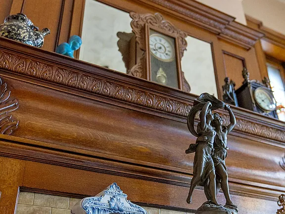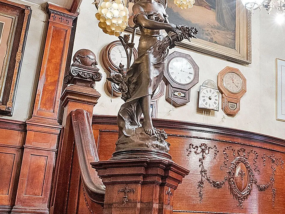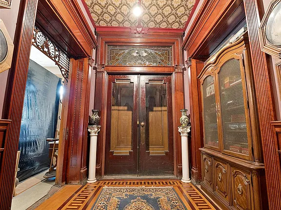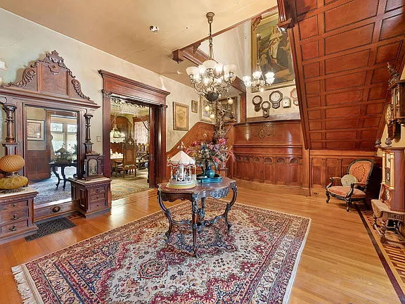 Inside, the level of craftsmanship is nothing short of breathtaking. The home features rich, heavily carved woodwork throughout, showcasing rare and luxurious materials such as black walnut, Circassian walnut, mahogany, and cherry. These features—painstakingly hand-carved and meticulously preserved—set a tone of elegance from the first step indoors. Each doorway, molding, banister, and built-in element tells a story of artistry and pride of construction.