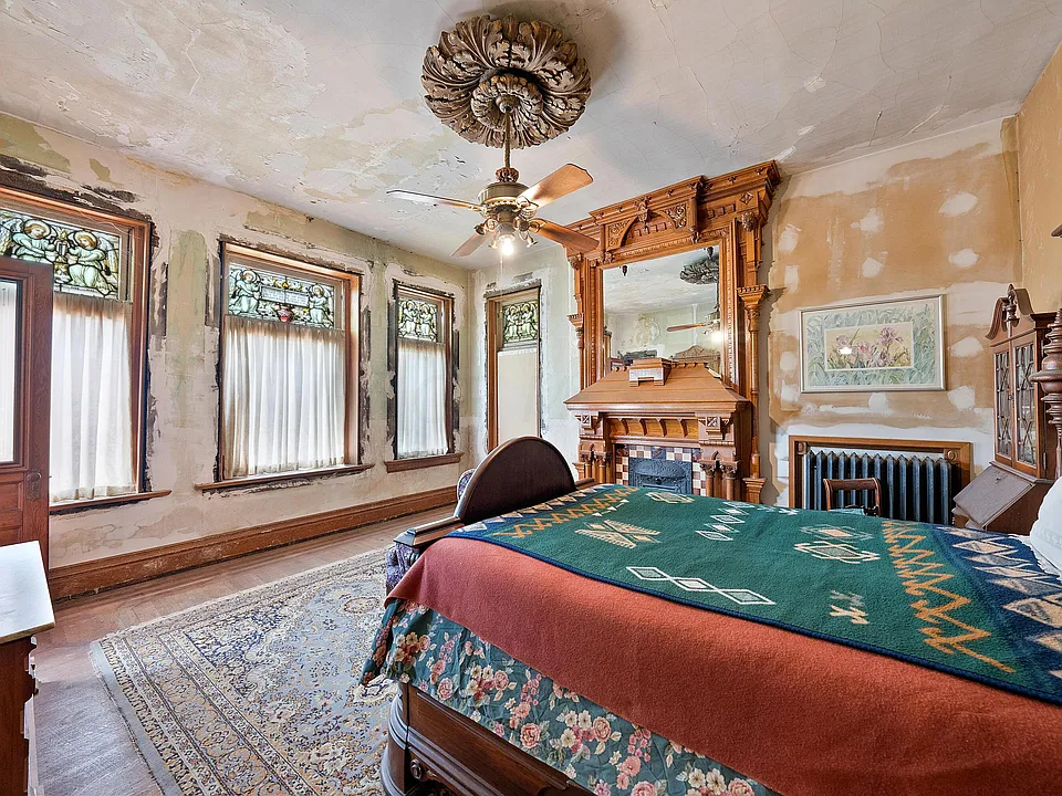 Additional interior features include five spacious bedrooms and three baths, including two full baths and one half bath. High ceilings, detailed fireplaces, and expansive windows contribute to an atmosphere filled with light, history, and timeless beauty. Although the home currently has no basement, it offers central cooling and flexible heating options.
