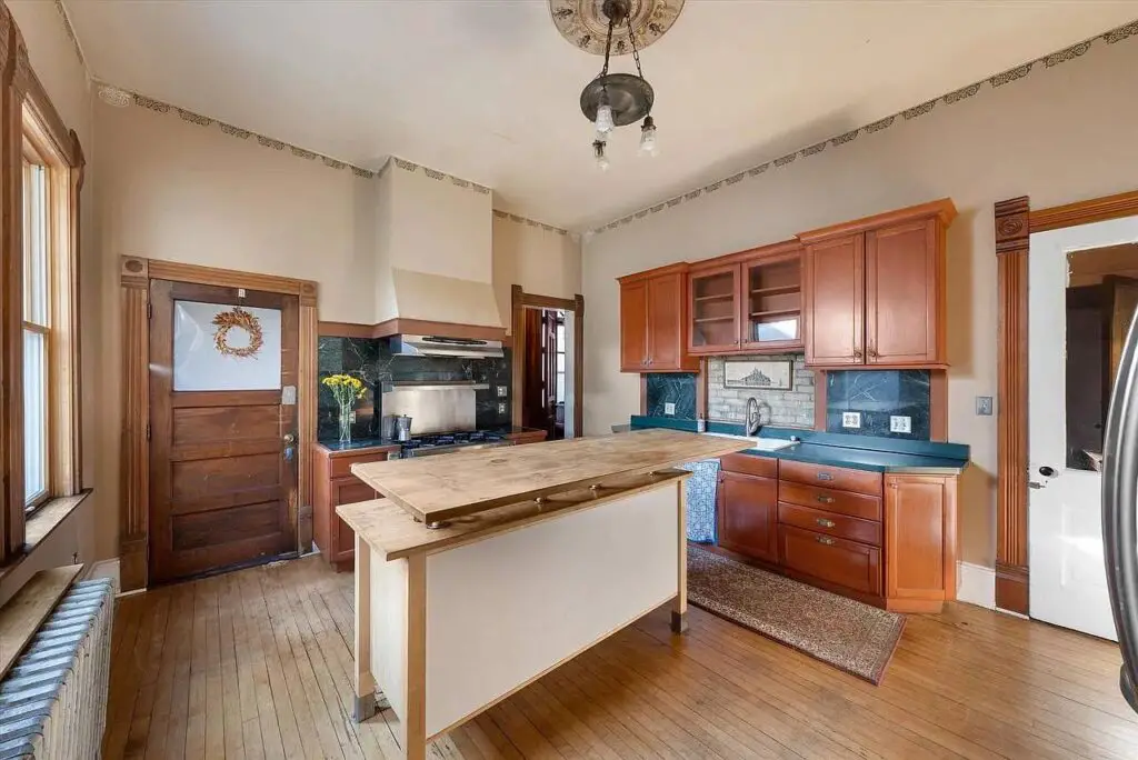 An elegant dining room anchors the main level, offering a setting that feels made for long dinners and meaningful gatherings. Its proportions suggest an era when dining was an event rather than a formality squeezed between obligations. Adjacent to the dining room, the eat-in kitchen balances historic charm with everyday practicality. While the home retains its period character, the kitchen’s layout supports modern living, offering space not only for cooking but for connection.