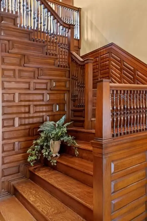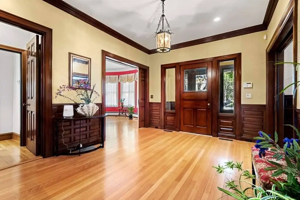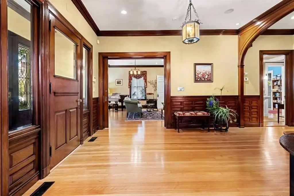 Stepping inside, the grand oak-paneled foyer delivers the type of unforgettable welcome one expects from a home of this stature. A sweeping staircase curves upward with an effortless fluidity, the balustrade shaped by the careful hands of turn-of-the-century craftsmen. The woodwork is monumental in quality, from the depth of the paneling to the warmth of the grain, creating a sense of grounded elegance that feels both historic and enduring. In many 19th-century homes, woodwork was often painted over or replaced, but here it remains preserved, celebrated, and restored—one of the many ways this property distinguishes itself.
