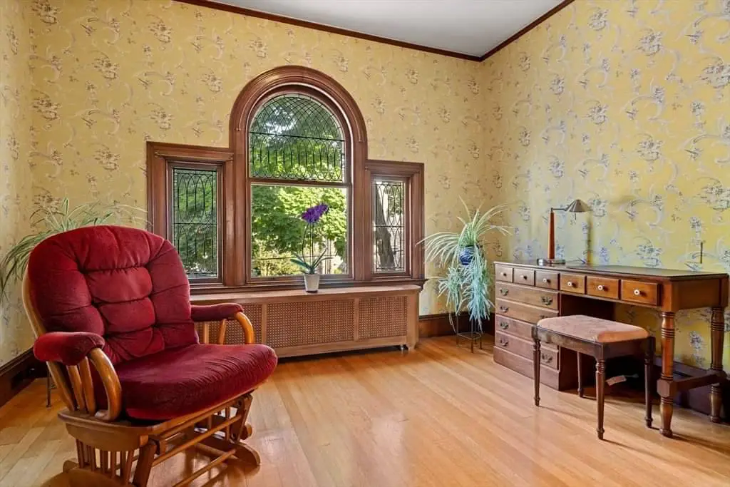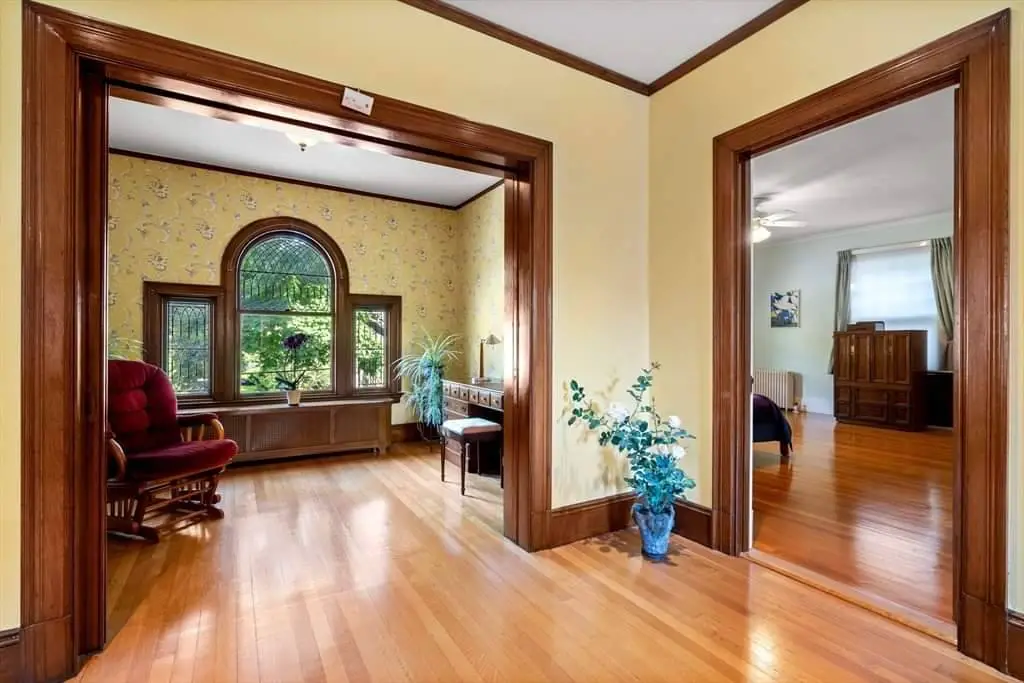 Throughout the house, period details enrich nearly every sightline. Original woodwork remains one of the property’s defining features, and the craftsmanship on display reflects a level of skill rarely achievable today. Stained-glass windows catch the light in surprising and beautiful ways, filling hallways and stairwells with color and shifting reflections. The pocket doors—four in total—are remarkable for their scale and preservation, sliding effortlessly into the walls just as they did in the 1890s. These details, combined with the ornamental trim, paneling, and carved newel posts, create a sensory experience that cannot be replicated with modern construction.
