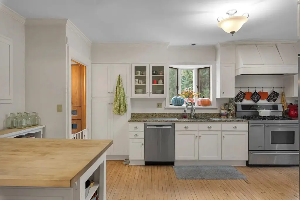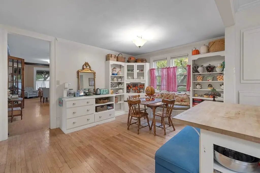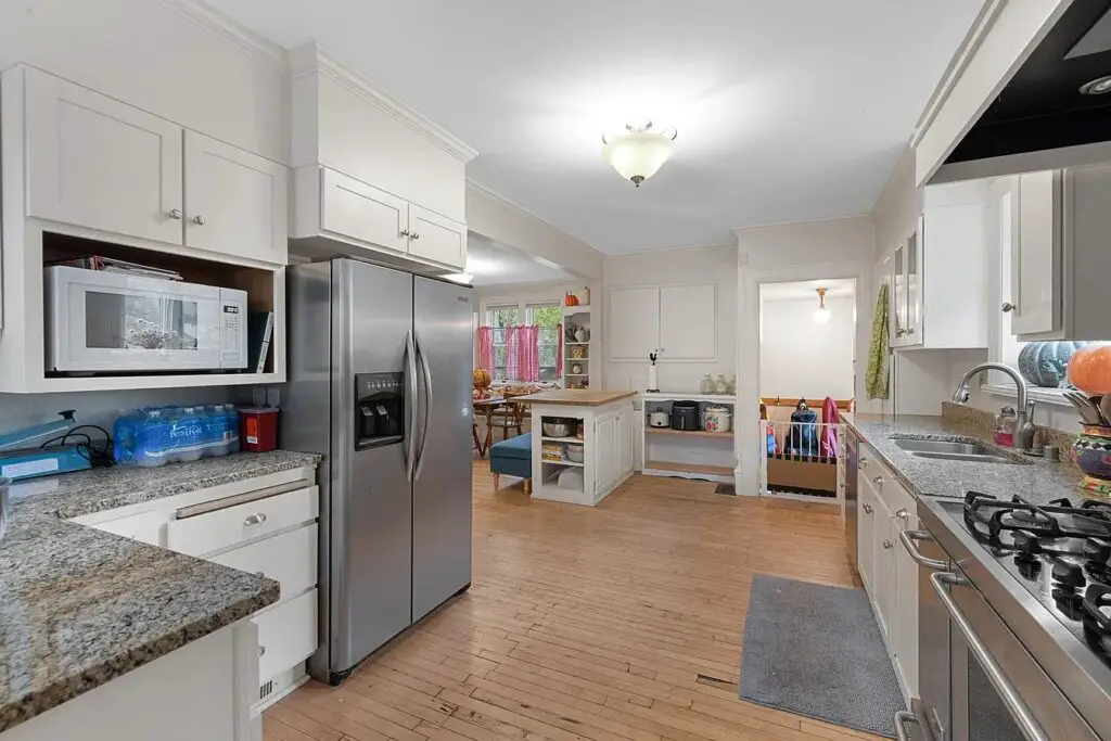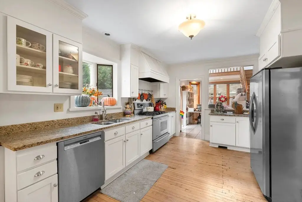 Moving through the main floor, the kitchen signals another dimension of the home’s character. While the architecture embraces the late nineteenth century, the kitchen offers the modernity necessary for contemporary living. Bright, open, and spacious, it features abundant cabinetry, generous countertops, and a striking six-burner gas stove that immediately appeals to those who love to cook or entertain. The layout allows for ease of movement, making it equally suitable for everyday meals and for hosting gatherings in the home’s many adjoining rooms. The connection between old and new feels natural here—no tension, no stylistic conflict. Instead, the kitchen becomes a harmonious element in a larger composition, enhancing the property’s livability without sacrificing its heritage.