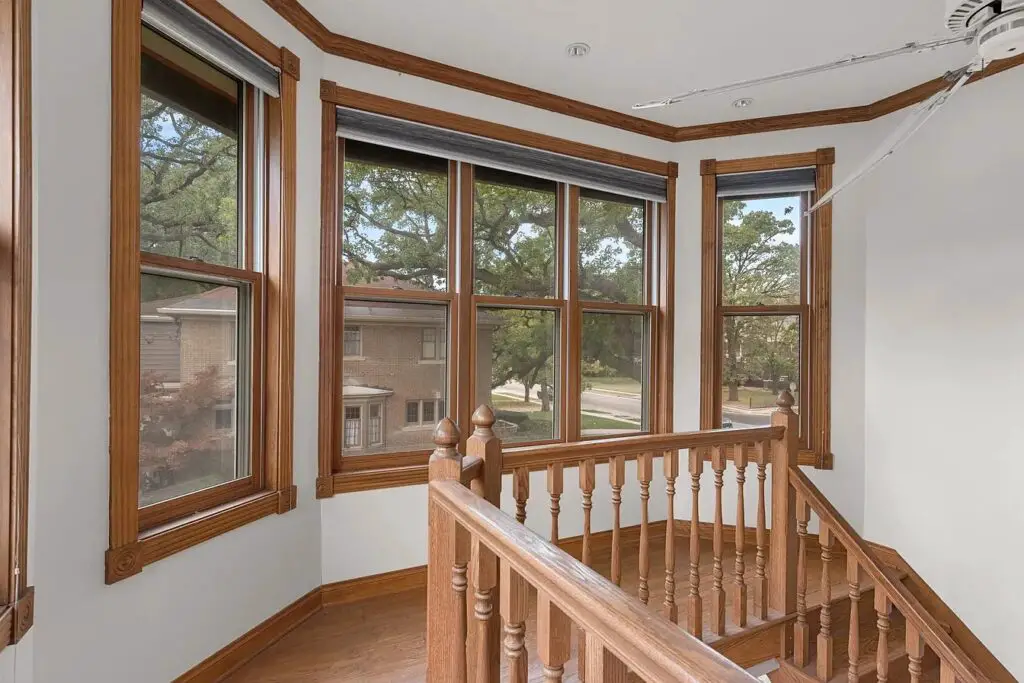 Just beyond this window lies one of the most enchanting features within the property—the two-story solarium. It rises vertically through the house like a lantern of glass, filling multiple floors with daylight. Unlike many sunrooms, which are pleasant but self-contained, this solarium behaves almost like an architectural heart. Light moves through it from morning through evening, casting shifting shadows against the curved walls and stained wood, creating a rhythm of illumination that brings the entire house to life. In winter, this space glows warmly. In summer, it becomes a breezy haven of greenery and quiet reflection. For anyone exploring historic homes for sale in Wisconsin, this solarium alone marks the property as extraordinary.