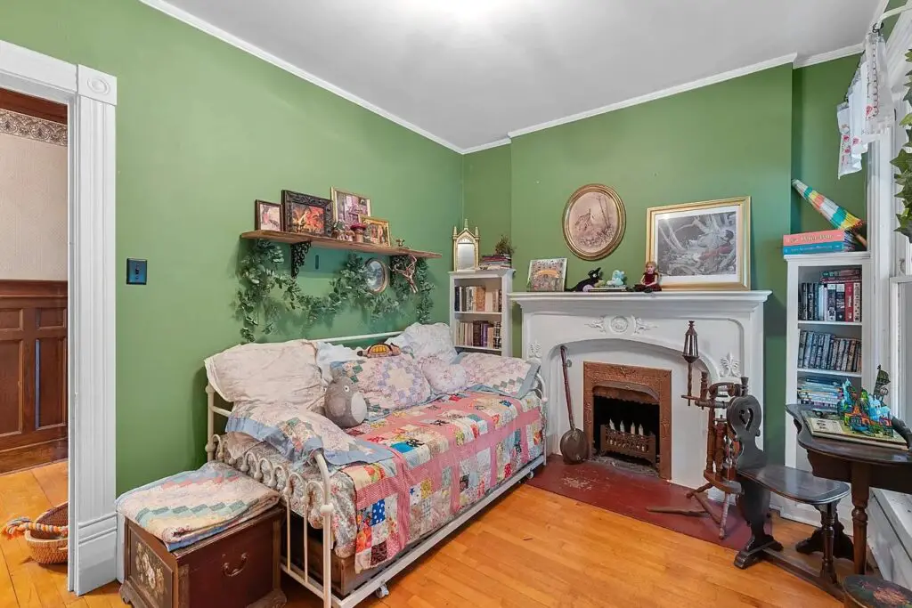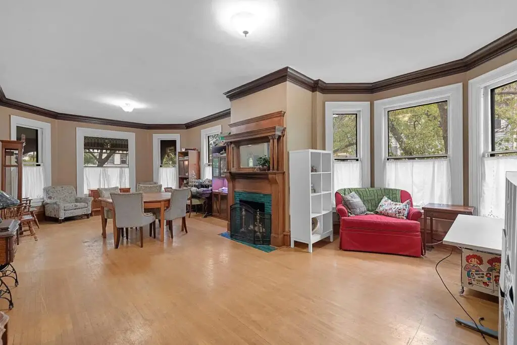 From the foyer, the home unfurls into a series of rooms filled with hallmark Queen Anne details—curved walls that soften transitions, projecting bays that create nooks of sunlight, and soaring ceilings that elevate even the quietest daily routines. The parlor offers one of the first glimpses of the curved architecture so deeply associated with this style. Sun pours through tall windows, illuminating intricate trimwork and molding that traces the perimeter of the room. Whether used as a formal sitting area, library, music room, or reading lounge, the space retains that unmistakable Victorian feeling of intimate formality.