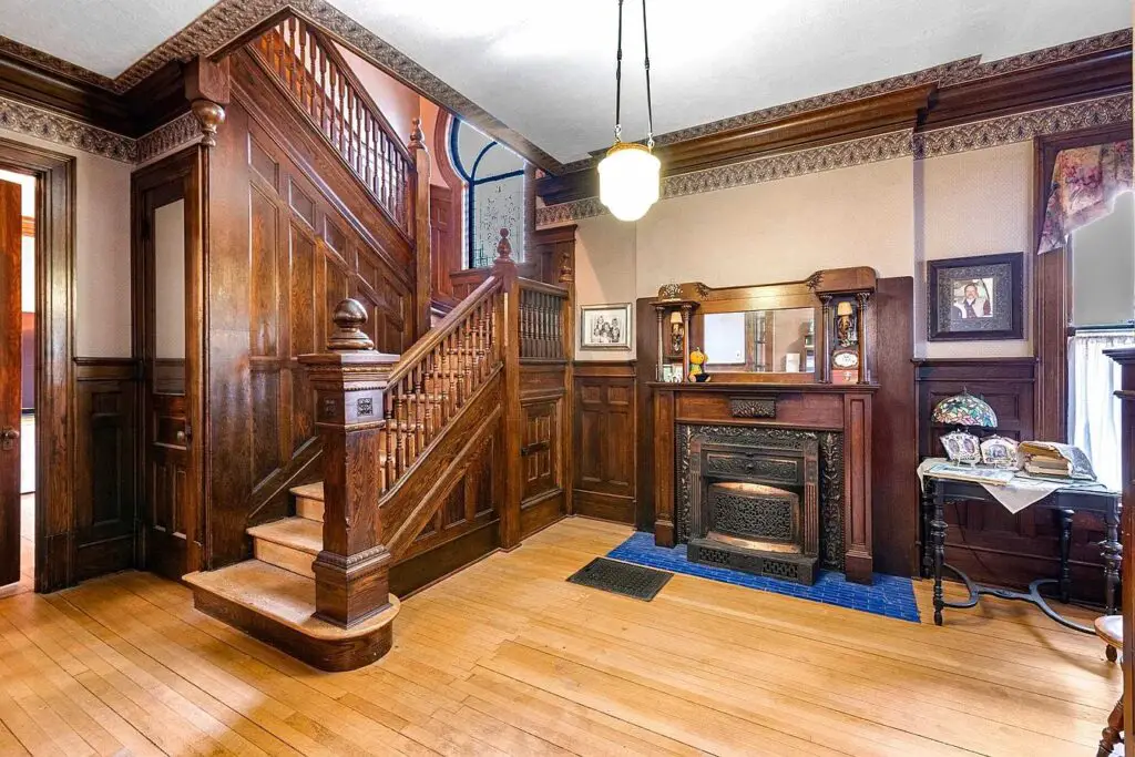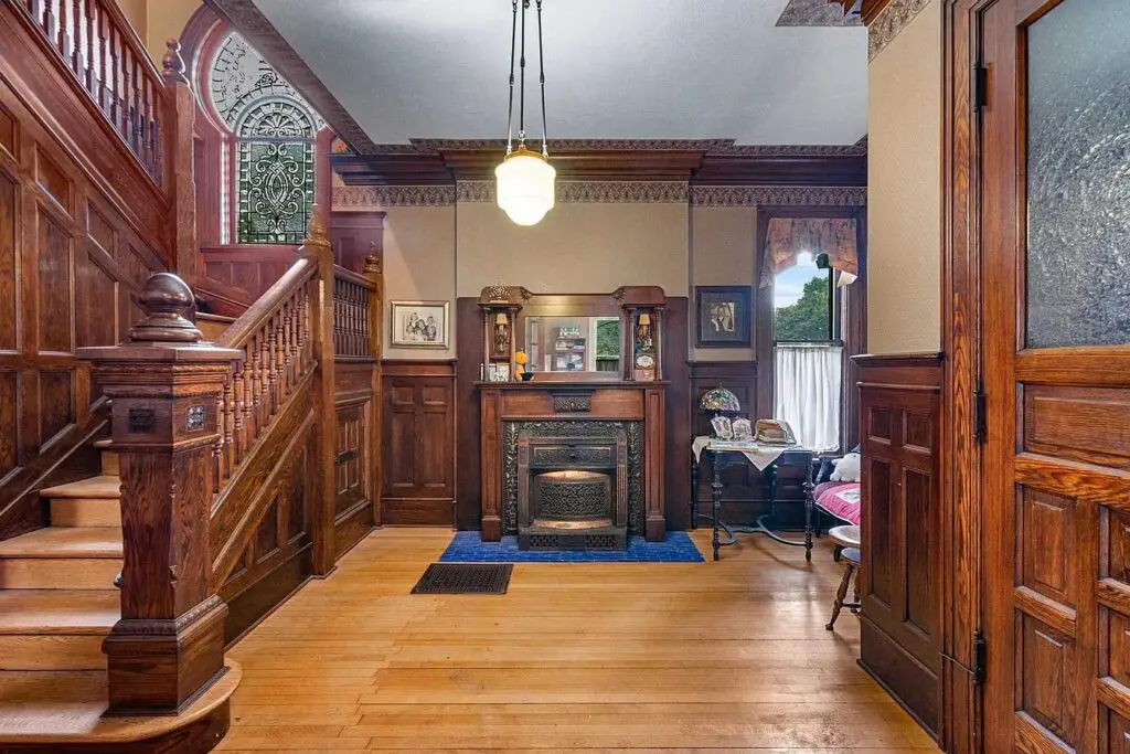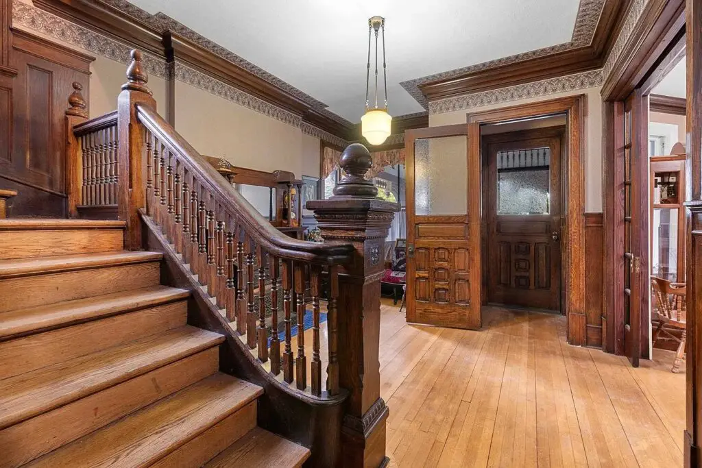 Stepping onto the broad front porch, the experience shifts from admiration to immersion. This is the Queen Anne style in one of its most expressive forms—the architecture inviting you not only to see it, but to inhabit it. From the moment you reach for the doorknob, there is a sense that you are about to step into a narrative still unfolding. The front door opens to a foyer remarkable even among historic homes. A sweeping staircase rises dramatically to the second floor, its curve gentle yet commanding, its newel posts solid and intricately carved. Light filters through both clear and stained leaded glass, scattering patterns across the original hardwood floors that have been preserved with pride. The foyer alone communicates what this property is: a showcase of craftsmanship, a time capsule of both design and culture, and a home meant to be lived in as much as admired.