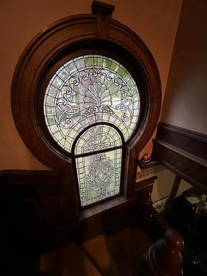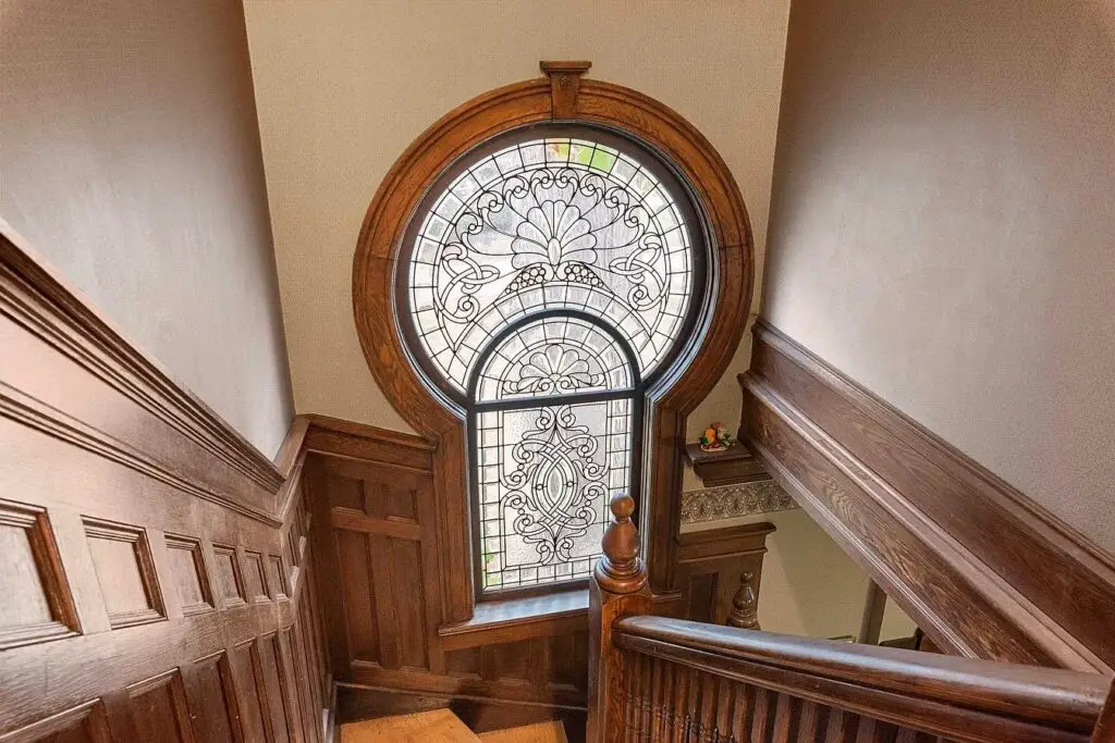 But the true showpiece of the home—the detail that distinguishes this residence not only in Fond du Lac but across the state—is the extraordinary leaded glass keyhole window. Considered one of the largest of its kind in Wisconsin, this architectural marvel sits like a jewel in the center of the home’s composition. Its dramatic silhouette curves upward and outward, tapering elegantly at the top, its interior panes forming patterns that diffuse sunlight in a way that feels almost ceremonial. Many historic homes boast leaded glass; very few possess something of this size, this complexity, this artistry. It is a signature element around which the rest of the home’s visual story seems to orbit.