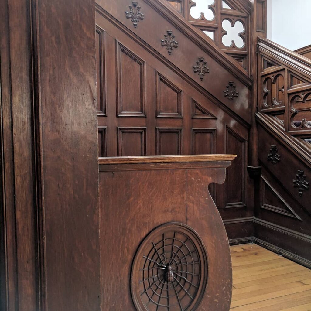 The main floor offers a spacious and interconnected layout that embodies both formality and comfort. Original architectural details are found throughout the living areas, from the ornate trim to the period light fixtures that glow warmly against the rich wood. The craftsmanship extends into the grand staircase, a structural and aesthetic centerpiece that curves gently upward and anchors the mansion’s vertical movement. To walk through these rooms is to understand how homes of this scale once functioned—not merely as places to live, but as expressions of legacy and social standing.