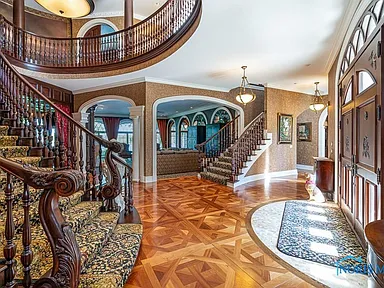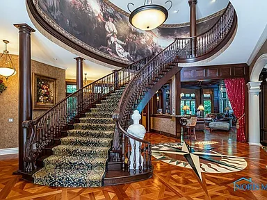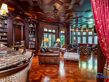 Upon entering this palatial home, you are greeted by a breathtaking floating staircase in the grand entry, immediately setting a tone of architectural sophistication. The home’s European influences are evident in the selection of the absolute finest materials: extensive use of marble, exquisite tile work, and custom hardwood floors grace nearly every space. The vast interior, totaling 10,547 square feet, is built for both lavish entertaining and comfortable family living. Notable features include multiple areas designed for socialization, including several built-in bars, ensuring that every gathering is a spectacular event. The finished basement adds an extra 2,600 square feet of functional space, broadening the home’s utility.