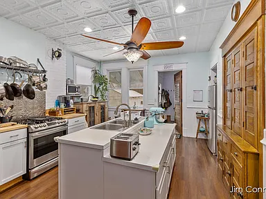 The main floor preserves much of the home’s original Victorian charm while integrating practical modern conveniences. It includes two large sitting rooms ideal for entertaining or relaxation, a formal dining room, and a well-equipped kitchen with a center island. The kitchen is outfitted with essential appliances, including a refrigerator, range, dishwasher, microwave, washer, and dryer.