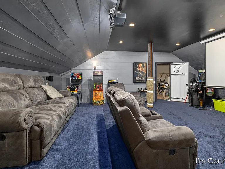 The third floor of the home provides an impressive array of specialty rooms rarely found in residential properties. A large woodshop accommodates craftspeople or hobbyists; a comfortable gym area provides ample space for exercise; a cozy reading nook is tucked into the tower, offering peaceful views; and a remarkable theater room creates the perfect environment for movie nights, sports events, or group entertainment. This floor also includes an additional half bathroom.