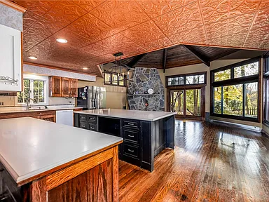 - Special Features: Leaded glass windows, natural woodwork, enclosed porch, patio, attic, jetted tub, kitchen island, cathedral ceilings, home office, den