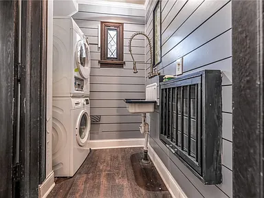 Although steeped in history, the home includes several valuable modern comforts. A first-floor laundry room—rare for homes of this era—adds everyday ease. The eat-in kitchen features a center island, abundant cabinetry, and direct access to the backyard, making it a functional hub of the home.