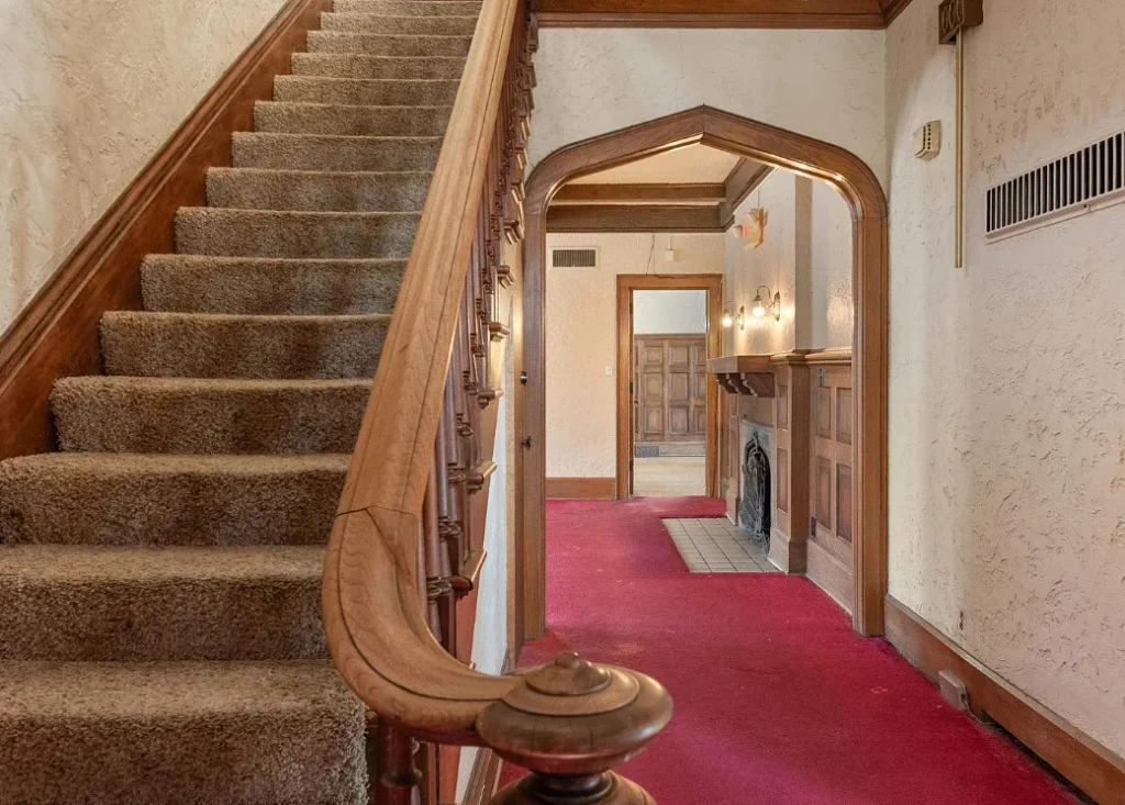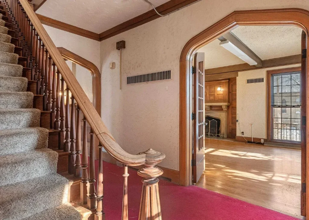 The first thing you’ll notice about this Queen Anne beauty is its imposing limestone exterior. It speaks of strength and timeless style—a true landmark in the neighborhood. But the real magic begins when you cross the threshold. You are immediately greeted by a dramatic oak staircase. It’s the kind of staircase you only see in classic movies, with beautiful woodwork that has stood strong for almost 150 years. This staircase is definitely one of the best features of the house and sets the tone for the quality of the rest of the home.