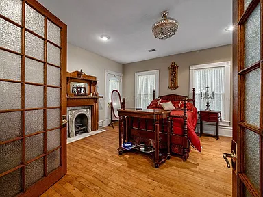 Stepping inside, the home reveals its elegant wood and tile flooring, intricate millwork, and beautifully restored period details. Multiple fireplaces—including gas-burning options—add warmth and charm to nearly every gathering space. Despite its Victorian age, the home incorporates modern essentials: updated electric systems, public sewer and water services, and HVAC systems powered by an efficient heat pump.