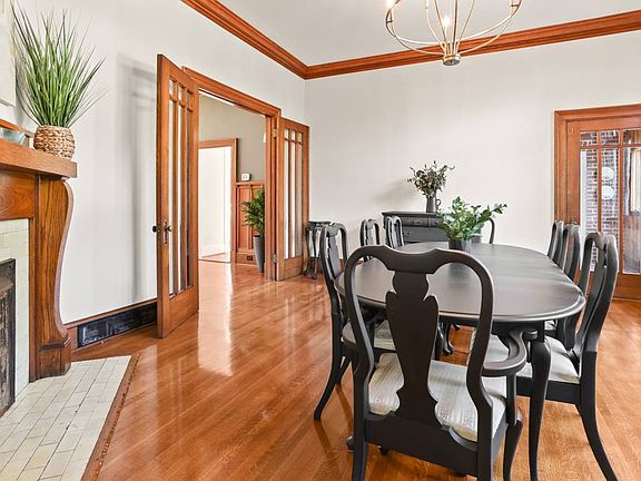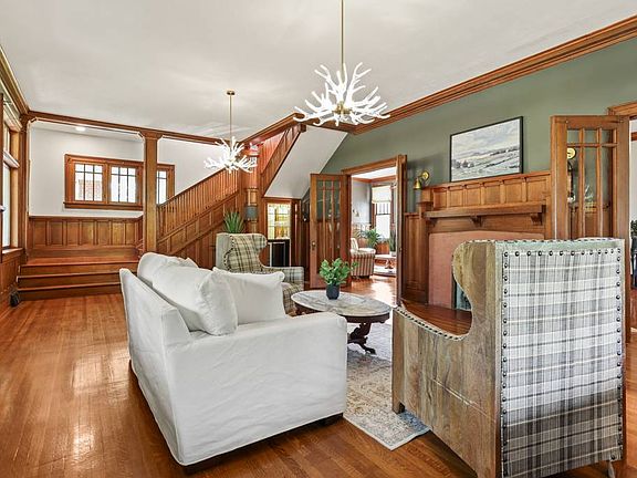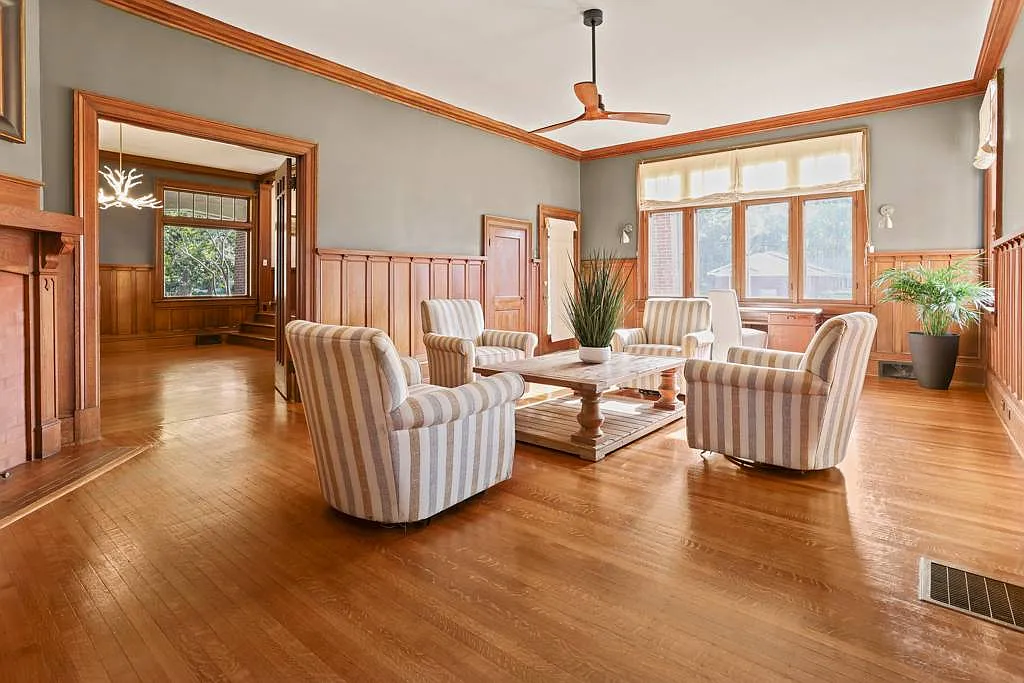 Inside, the craftsmanship immediately sets the tone. Tiger oak wood trim frames doorways, windows, and staircases, wrapping the interior in warmth and visual richness. This level of detail is difficult, if not impossible, to replicate today without extraordinary cost. Original hardwood floors run throughout the home, grounding each room with a sense of continuity. High ceilings amplify light and air, while paneled wainscoting and period millwork reinforce the home’s architectural authenticity. These elements are not isolated accents but part of a cohesive whole, reminding occupants that this house was built with care and intention.