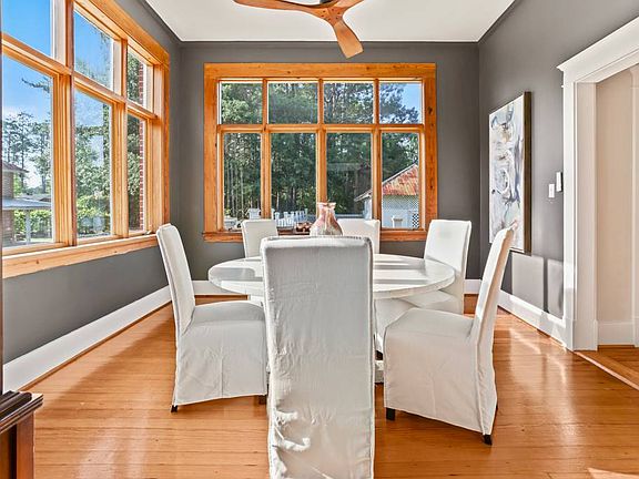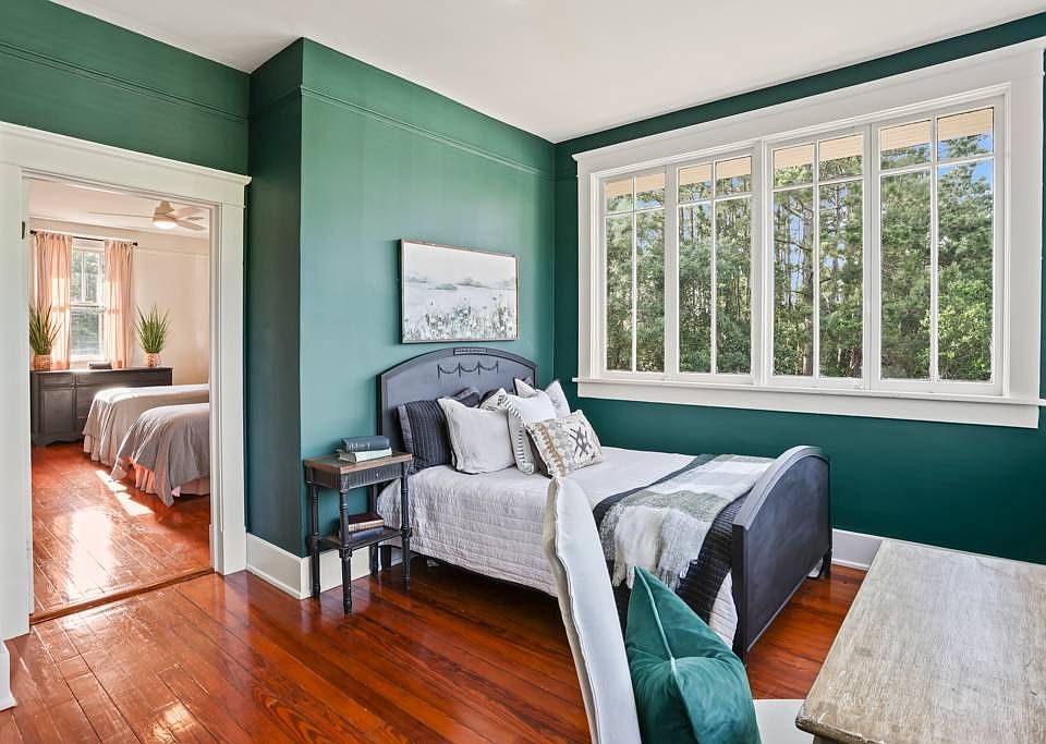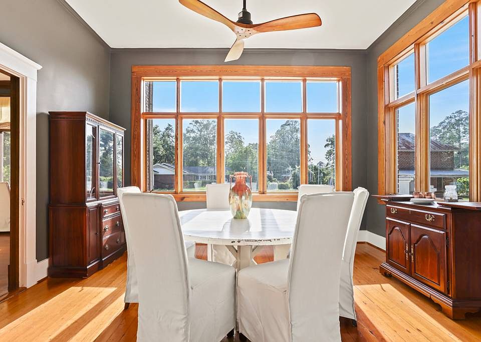 Adjacent and nearby spaces expand the home’s versatility. A sunlit Carolina room with wraparound windows offers flexibility that modern buyers increasingly value. Whether used as a breakfast nook, reading room, office, or guest space, it connects the interior to the surrounding landscape in a way that feels organic. Natural light floods the room, reinforcing the connection between indoors and outdoors that is central to Southern architectural traditions.