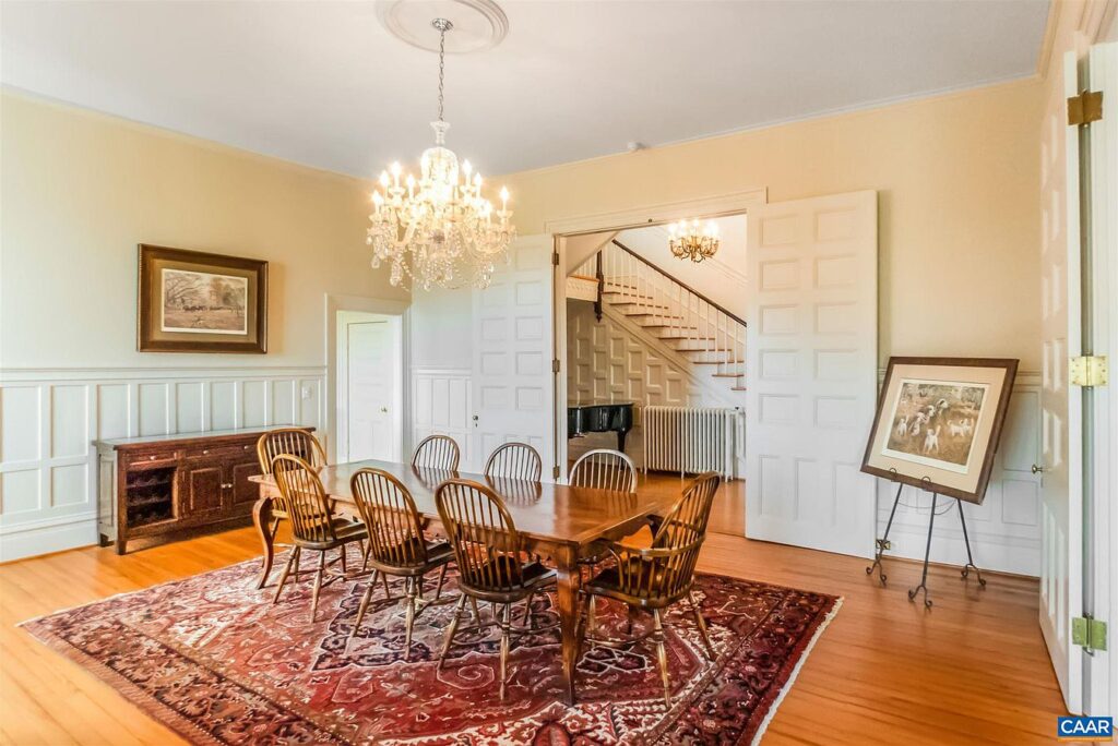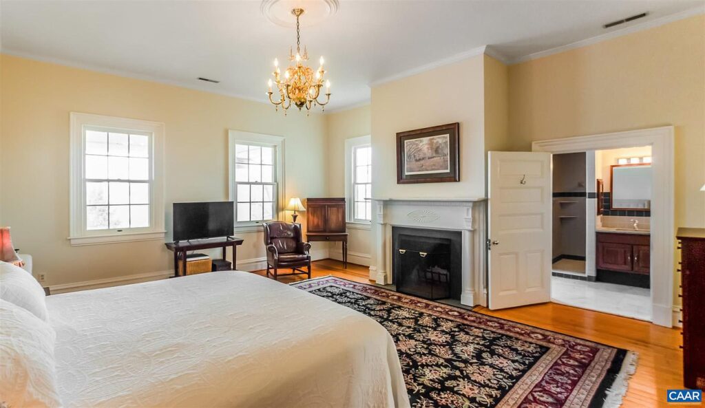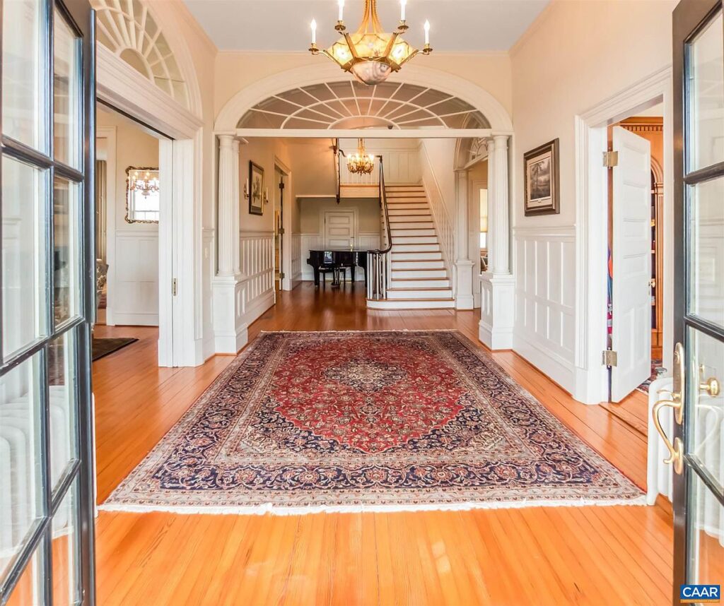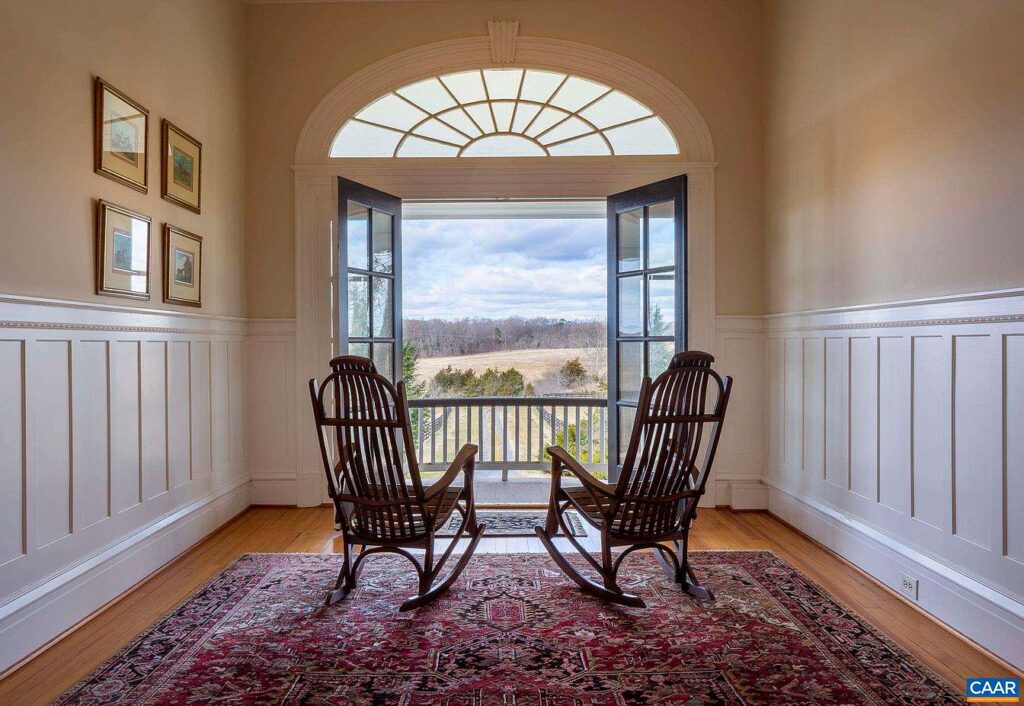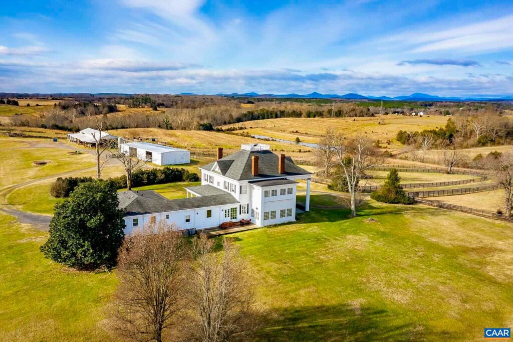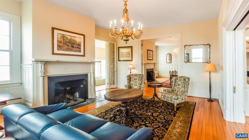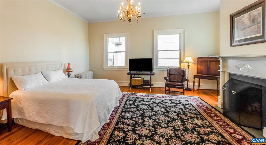 Among its most striking features is the grand staircase, a centerpiece of the entrance, and the dramatic double front doors. The home is completed by a covered front porch and a balcony, offering serene spots to enjoy the surroundings. Perhaps the most unique feature is the widow’s walk, which provides unobstructed, sweeping views of the picturesque Virginia countryside and the sprawling estate below. With four bedrooms and five well-appointed bathrooms, the residence effortlessly combines historic charm with modern functionality.