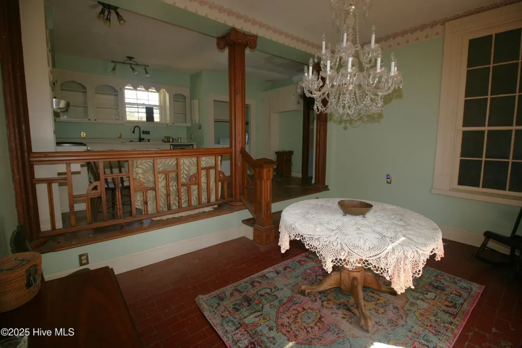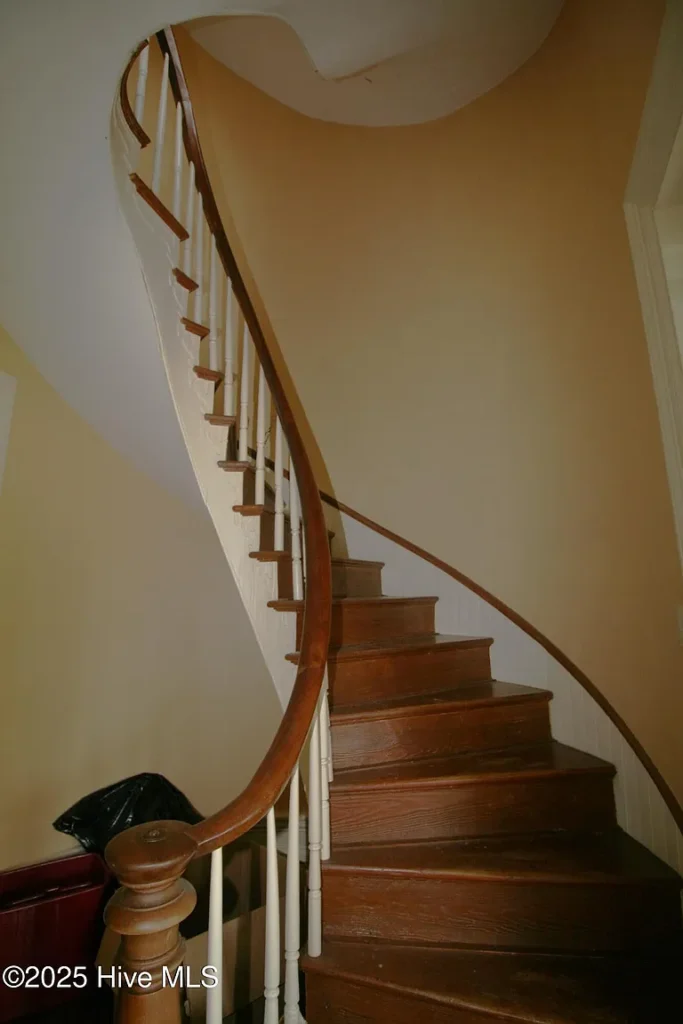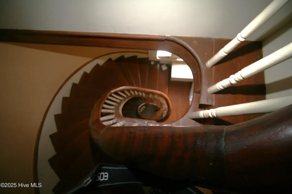 Stepping through the front door, you’re immediately greeted by original hardwood floors and an impressive spiral staircase—a stunning architectural feature that embodies the elegance and craftsmanship of the era. The wide foyer and spacious main living areas exude warmth and character, creating a welcoming environment that feels both timeless and full of potential.