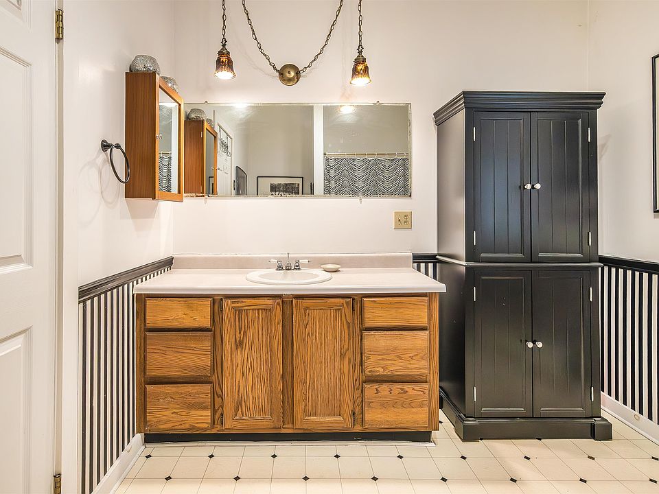 Inside, soaring cathedral ceilings create a dramatic first impression, paired with beautiful period woodwork and classic detailing. Floor-to-ceiling windows in every room flood the space with natural light, accentuating the recently refinished hardwood floors in the living and kitchen/dining areas. The open kitchen has been updated with an oversized granite island ideal for seating and entertaining, along with space for a full dining table, with a striking arched inlaid buffet providing additional storage.