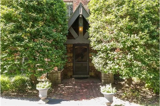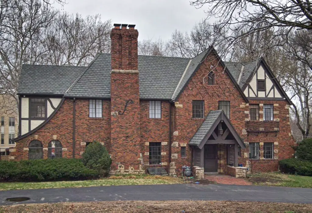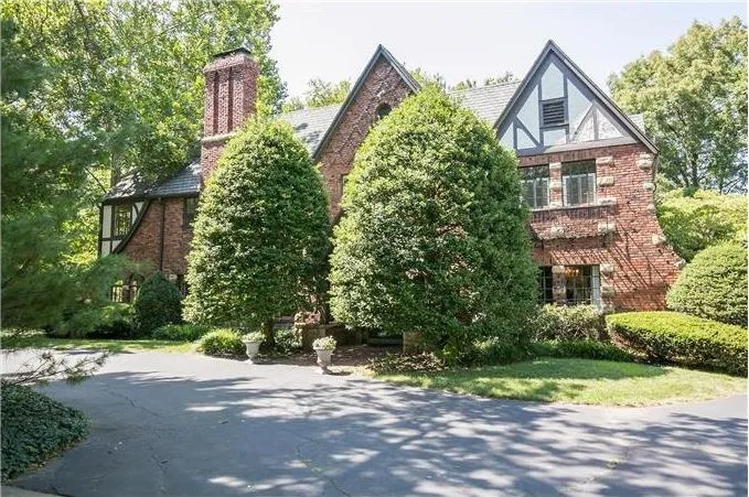 The home’s exterior was a textbook example of Tudor Revival style, blending multi-colored brickwork with rich stone accents, decorative half-timbering, and a prominent brick chimney. A grand Tudor-style portico framed the front entrance, offering a striking focal point that emphasized the home’s classic symmetry and charm. Surrounding the house was a lush, mature landscape, softening the architectural lines and enhancing its timeless appeal.