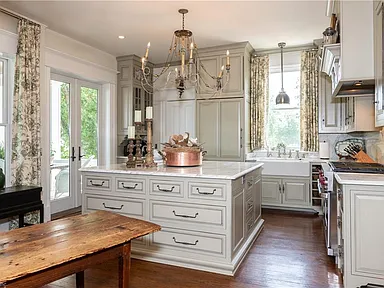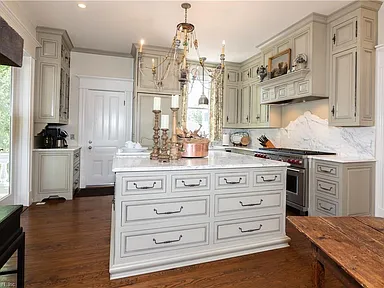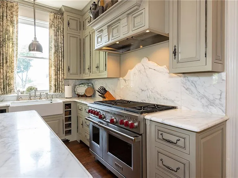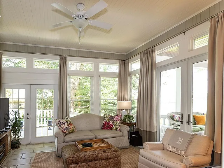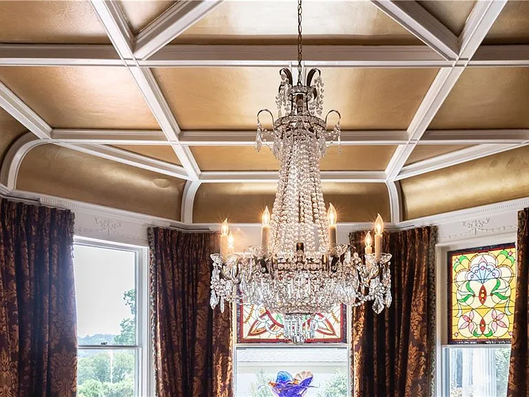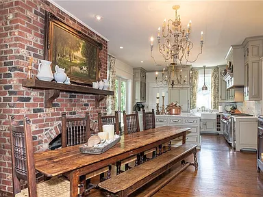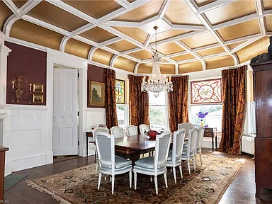 The mansion features an impressive array of rooms designed for both beauty and functionality. A bright sunroom captures the shimmer of the river, creating a serene space to enjoy morning coffee or an afternoon read. The eat-in kitchen blends traditional charm with modern appliances, including a gas range, dishwasher, and refrigerator.