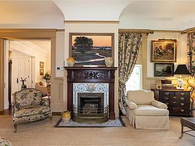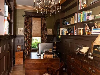 From there, the formal living room continues the theme of refinement, while the library invites quiet reading and reflection surrounded by character-filled woodwork.