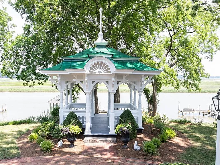 Set on nearly an acre of deep-water frontage, the property is designed for both elegance and leisure. With its private pier, boat lift, floating dock, and picturesque gazebo, this home offers a rare lifestyle that merges historic grandeur with riverfront living.
