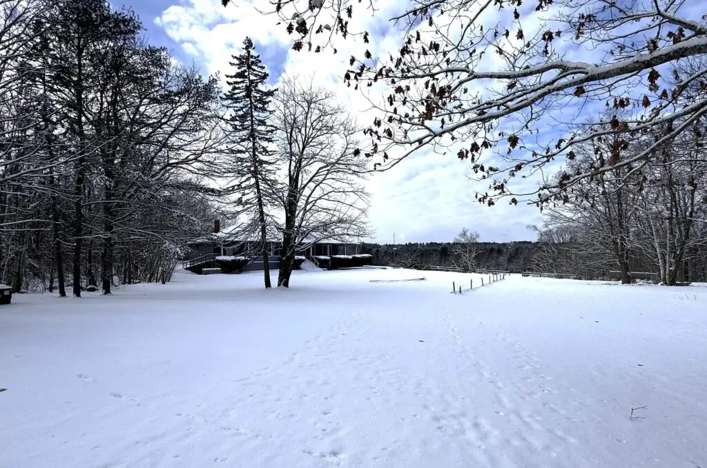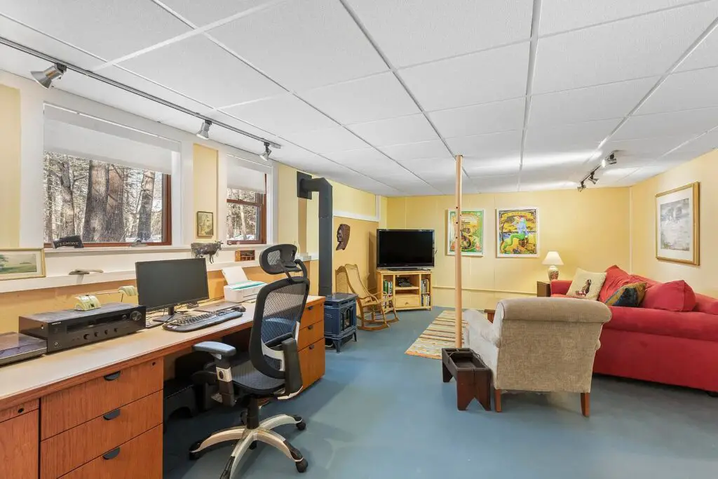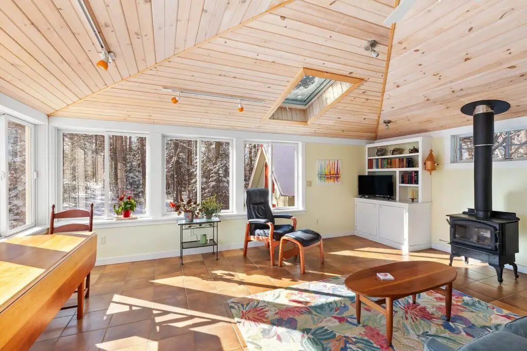 The home welcomes you with warmth and light the moment you step inside. The main level features an open living room with soaring cathedral ceilings, creating a spacious yet cozy atmosphere perfect for gatherings. A well-appointed kitchen anchors the space, designed for both functionality and comfort. The glass-enclosed dining and family room, complete with a woodstove, is a true highlight—offering panoramic views of the backyard and wooded landscape beyond. It’s the ideal spot for morning coffee, quiet reading, or dinners overlooking nature’s calm.