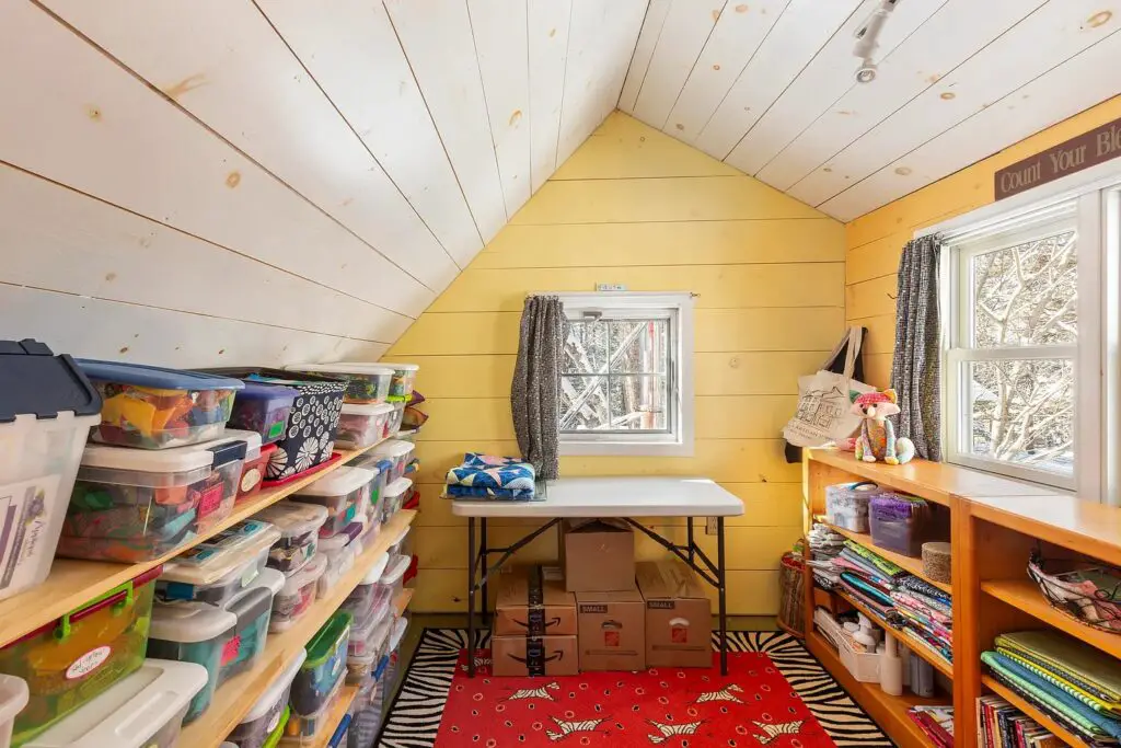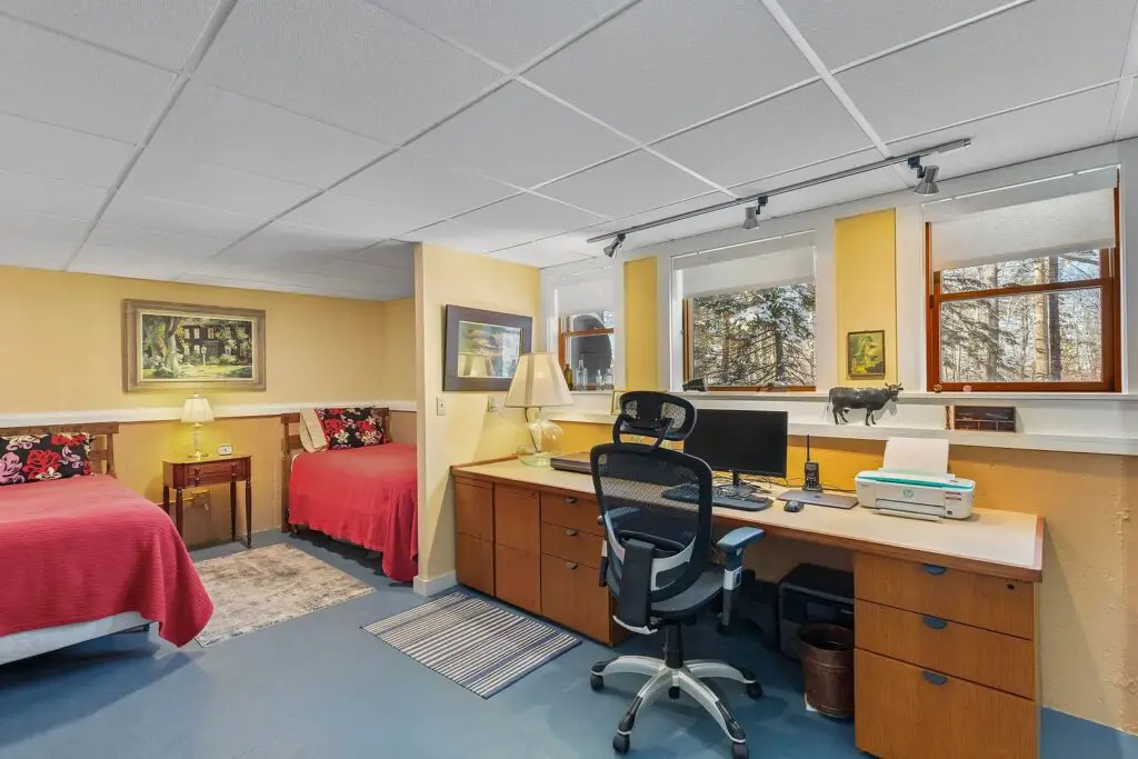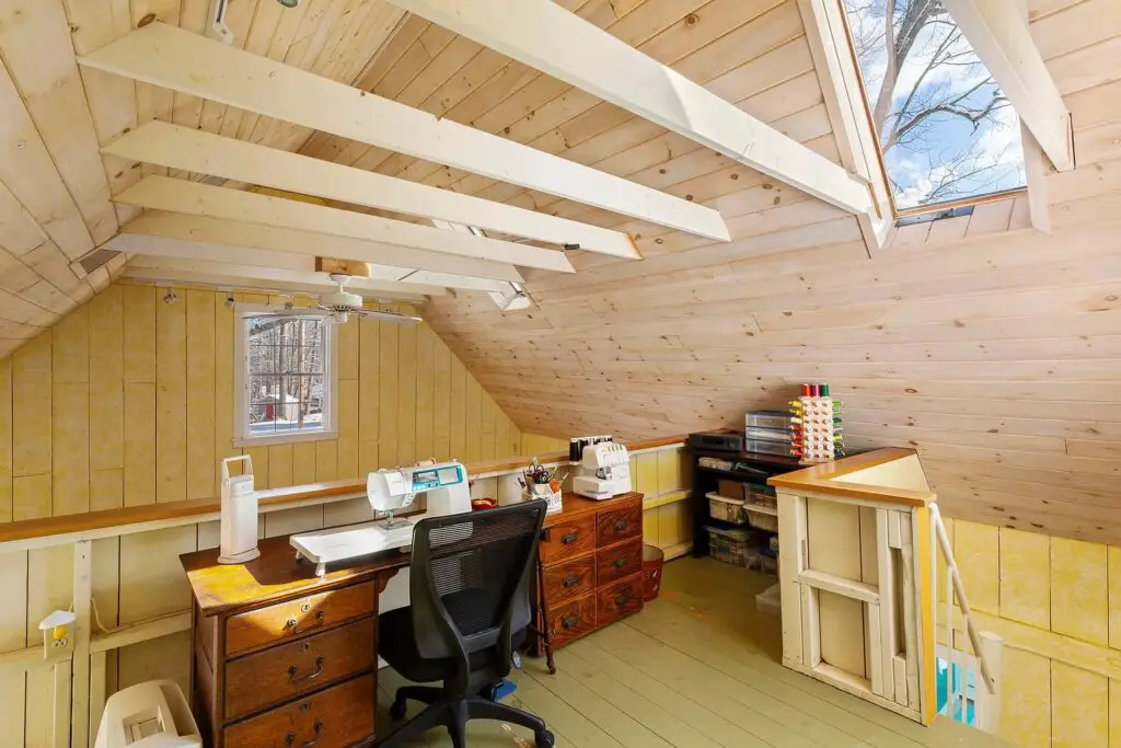 The primary bedroom suite is conveniently located on the first floor, offering ease and privacy. Upstairs, a charming loft area provides flexibility for an additional bedroom or creative space, currently used as a craft studio. The recently finished lower level adds significant versatility, featuring a full bathroom, bedroom, office area, laundry, and a cozy TV room—perfect for guests or extended family stays.