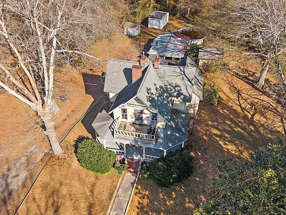 The home offers a large footprint with 5 bedrooms and 2 full baths, high ceilings, original trim, stained-glass windows, and four fireplaces-historic features that can drive strong resale value once restored. Existing structures include a deep front porch, rear carport, above-ground pool, and multiple storage buildings, offering added utility or redevelopment options.