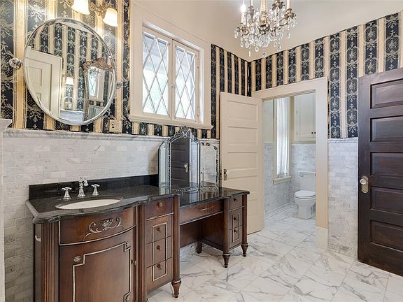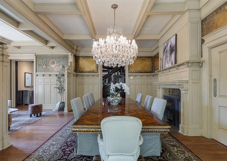 The open-concept formal dining and greeting rooms are adorned with original fresco scenes, built-in seating and detailed woodwork. The dining room includes a mock fireplace and illuminated lead-glass cabinetry. Upstairs, the primary ensuite is a luxurious retreat with its own sitting room, fireplace and dressing area. Two additional bedrooms, two bathrooms, study with pocket doors and laundry room complete the second floor.