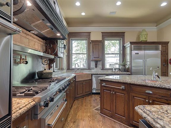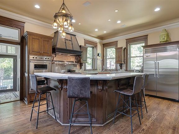 The third floor offers two more bedrooms, a full bath and a grand, versatile bonus room that once served as a ballroom. Downstairs, the finished basement includes a wine and cigar room and a convenient half bath. A detached garage apartment, built in the early 2000s, provides one bedroom, a full bath, kitchen, dining space and living area with two walk-in closets—ideal for guests. Enjoy the expansive front porch overlooking Hudson and 14th Street, a porte-cochere with built-in gas grill and a location that’s walkable to downtown, Midtown and Uptown 23rd. This is an extraordinary opportunity to own one of the most iconic homes in one of OKC’s most beloved neighborhoods.