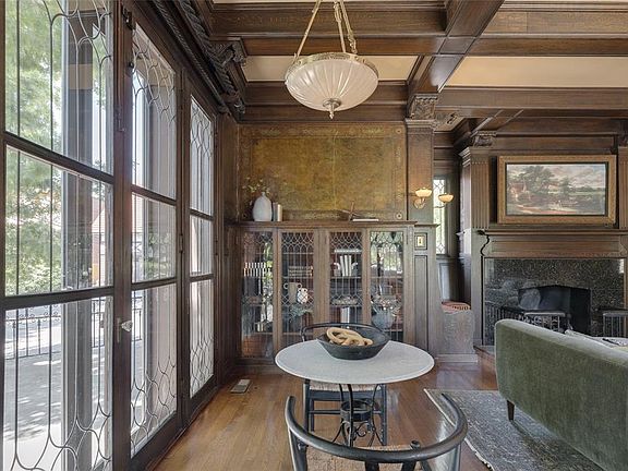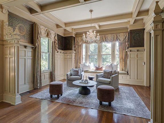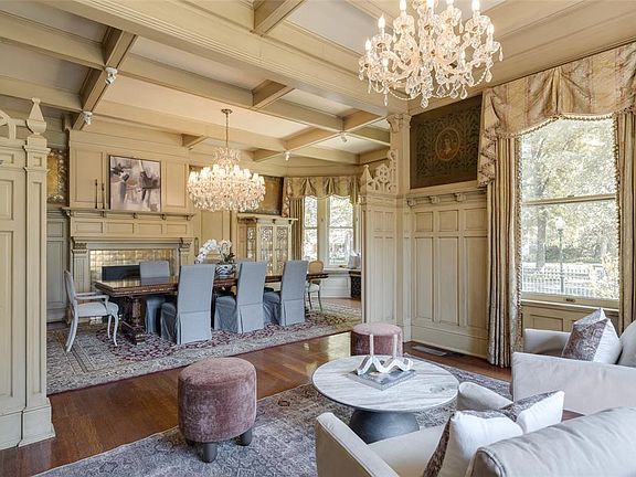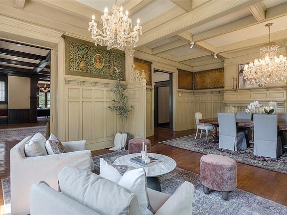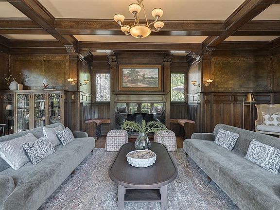 The stunning formal living room features tall wainscoting, frescoed panels, crisscross oak beam ceilings and quarter-sawn oak bookcases with leaded glass and interior lighting. A stately fireplace with hidden TV flanked by cozy seating nooks anchors the west wall, while four oversized windows on the East wall bathe the room in natural light and French doors on the South wall open to a private side porch.