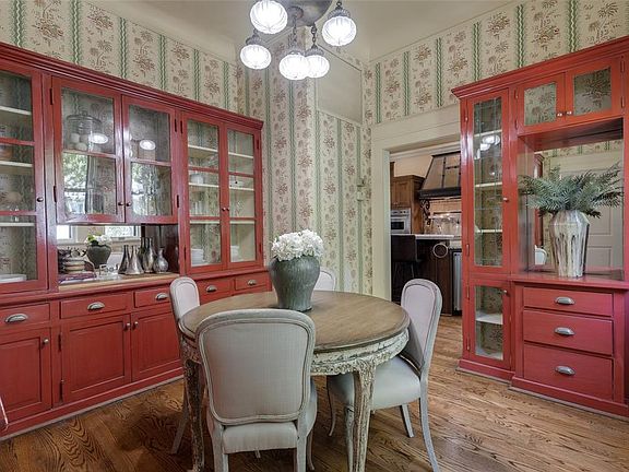 - Dining Room: Open-concept with original fresco scenes, illuminated lead-glass cabinetry, and built-in seating.