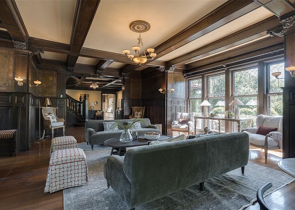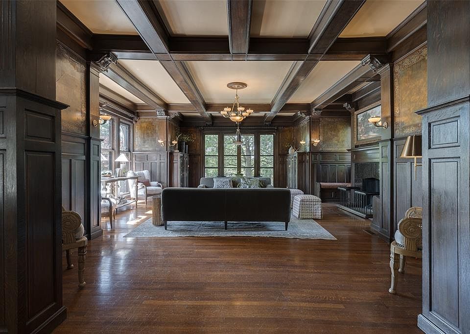 - Living Room: Tall wainscoting, frescoed panels, crisscross oak beam ceilings, and built-in quarter-sawn oak bookcases.