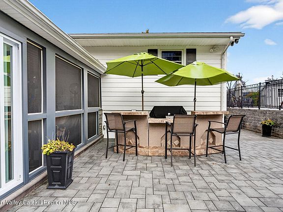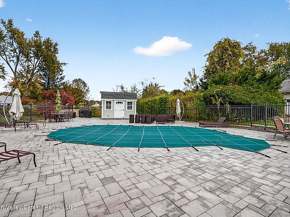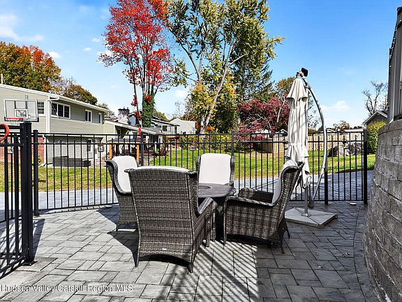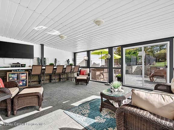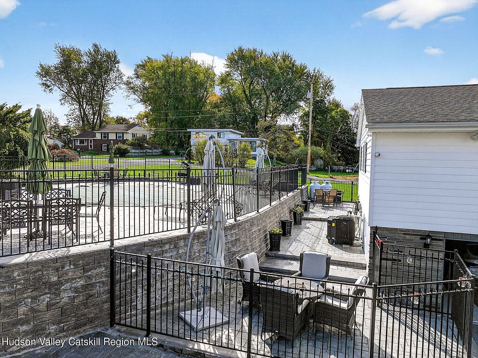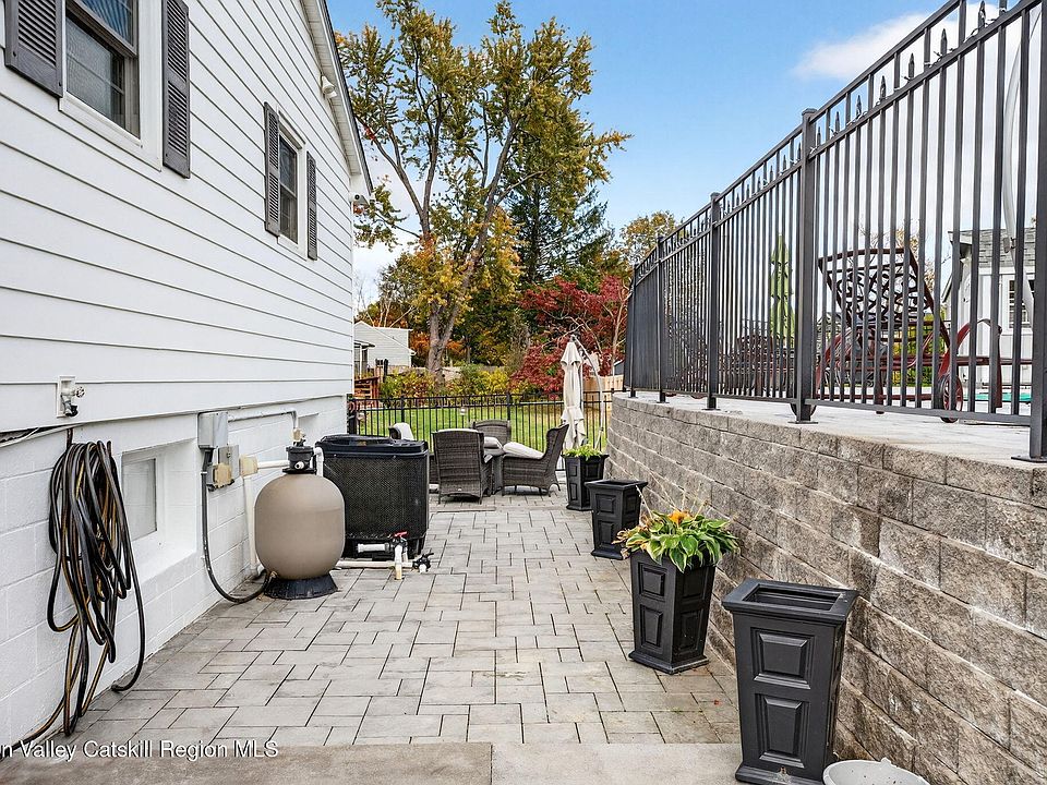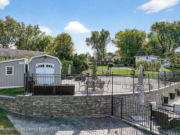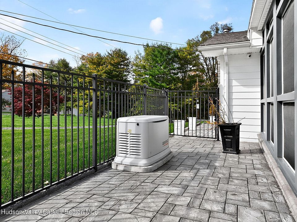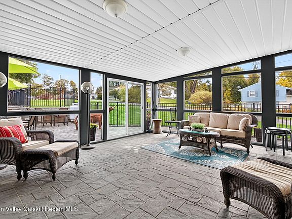 The backyard is designed for pure relaxation. There is a sparkling heated in-ground pool surrounded by pretty paver patios. The side porch is screened-in, so you can enjoy the breeze without the bugs, and it leads you right out to the water. The yard stays perfectly green all summer thanks to a built-in sprinkler system. You are also just a quick trip away from the historic stone houses of Old Town Hurley and the fun shops in Uptown Kingston. It really is the best of both worlds!