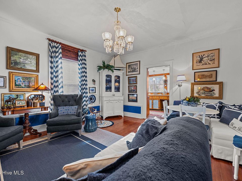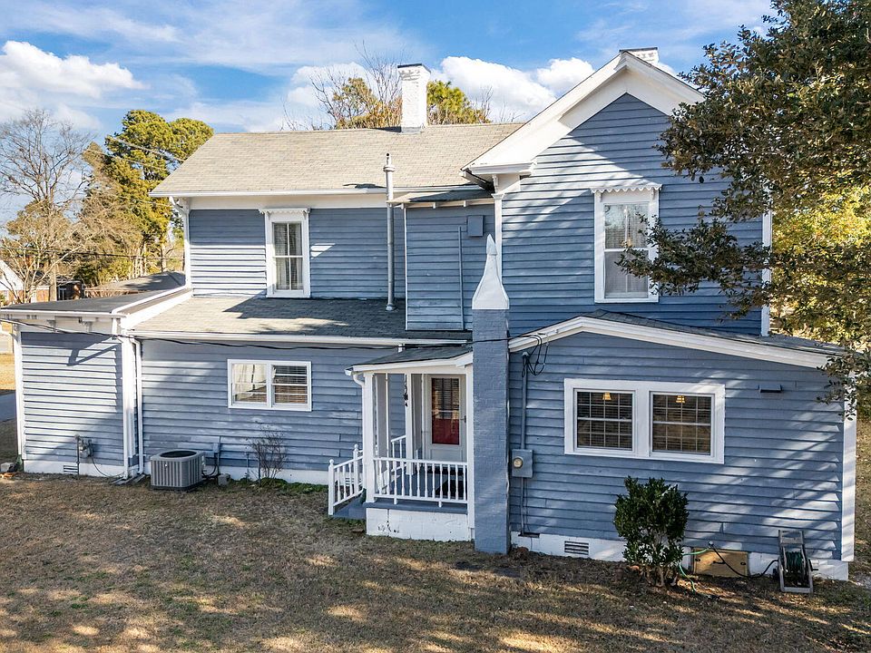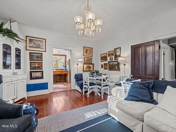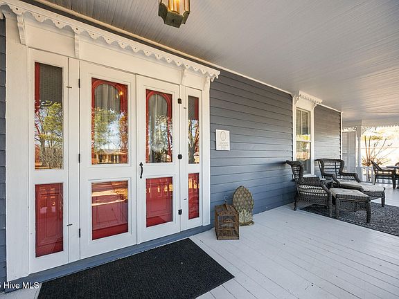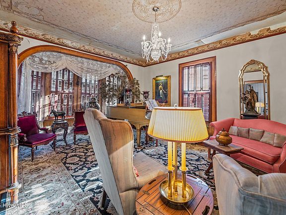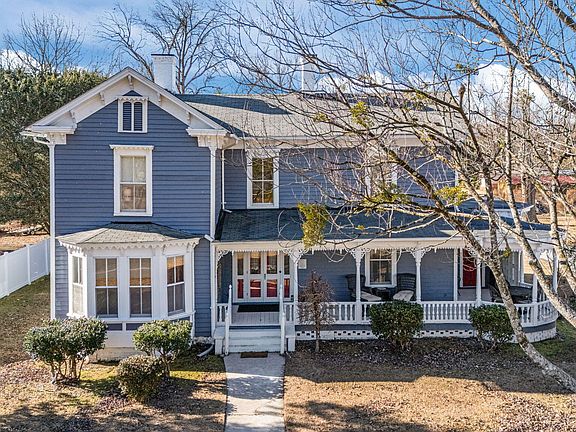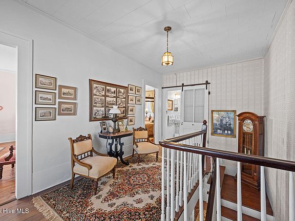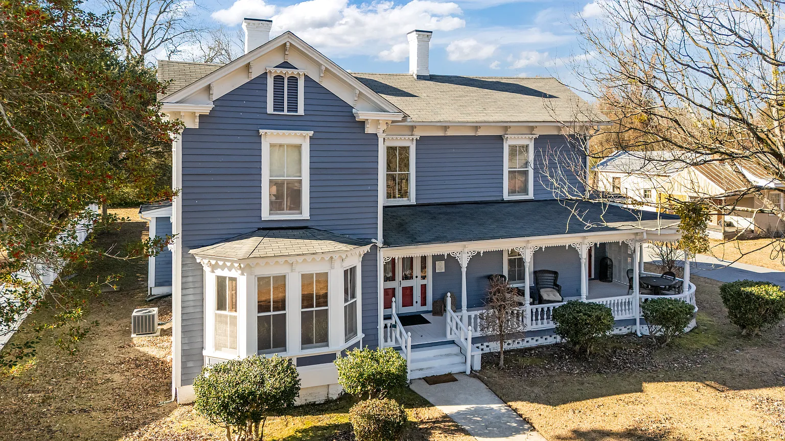 The Long-Haislip House (c.1885) is a two-story Queen Anne-style residence that blends thoughtful modern updates with beautifully preserved historic character. From the moment you arrive, the elaborate wrap-around front porch signals the home’s significance and charm. Step inside to a gracious foyer featuring heart-pine floors, the original staircase, and exquisite period details.