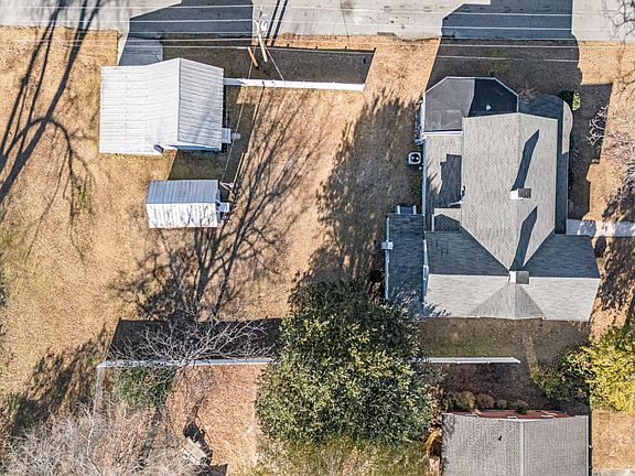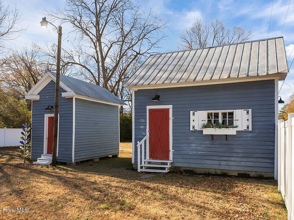 - Outbuildings: Original smokehouse (used for storage), a secondary larger storage building, and an open garage.