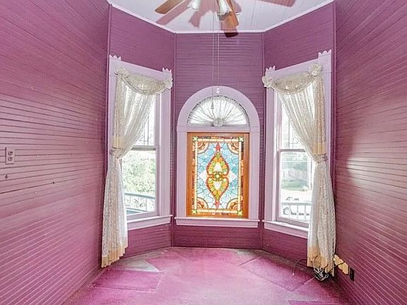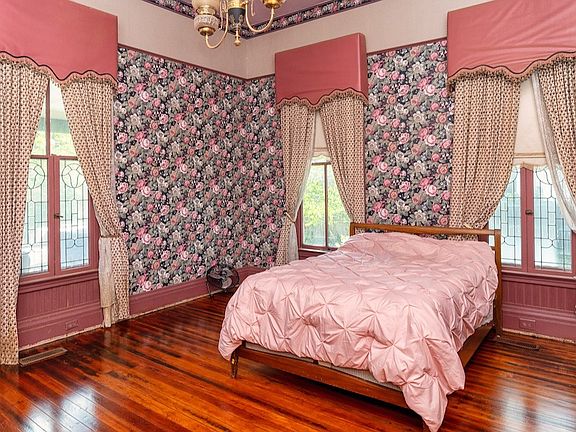 The first floor features one bedroom, while the 2nd floor houses the remaining four, not including a small cornered front room referred to as the "red room." Leaded and stained glass windows illuminate the interior, including the third-floor unfinished walk-up attic that can be utilized for storage or finished in the future.
