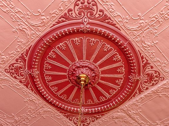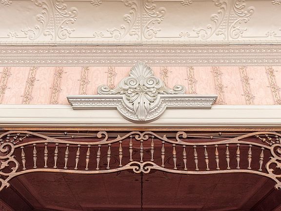 There is a balcony off of a 2nd floor bedroom with a charming view of the yard and street below. Inside, an impressive foyer is flanked by formal parlors with restored metal ceilings and original pocket doors, leading to a massive half-round dining room graced with 7-foot curved windows.