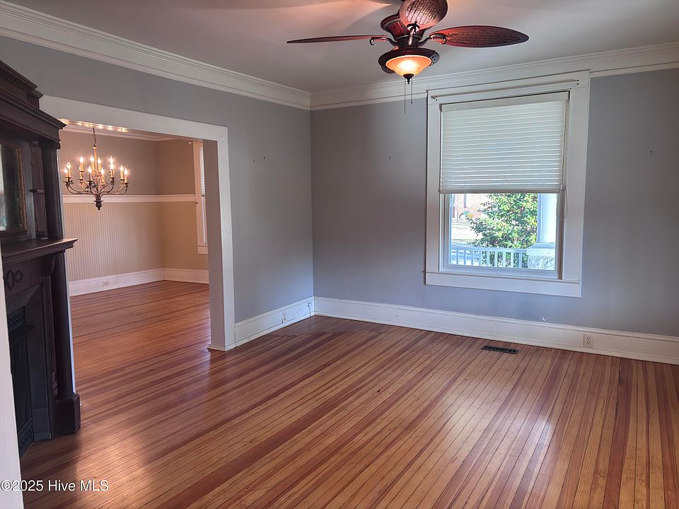 Across the foyer is the formal living room, and it is a beauty. It features a gorgeous antique mantle with gas logs, so you get the look of a vintage fireplace with the ease of modern heat. This room flows right into the formal dining room, which is perfect for hosting big family dinners. The dining room even has a door that leads out to the side porch, so you can let the fresh air in while you eat.
