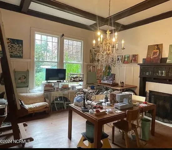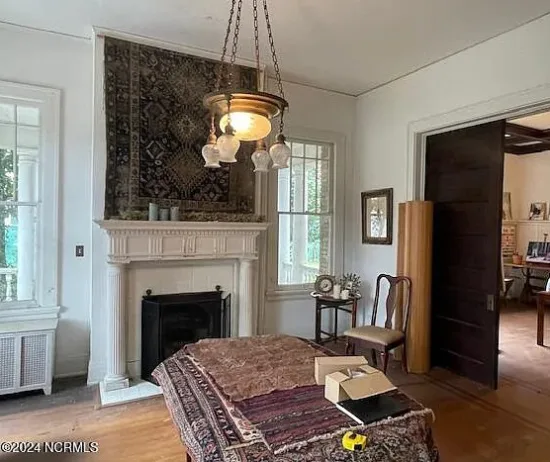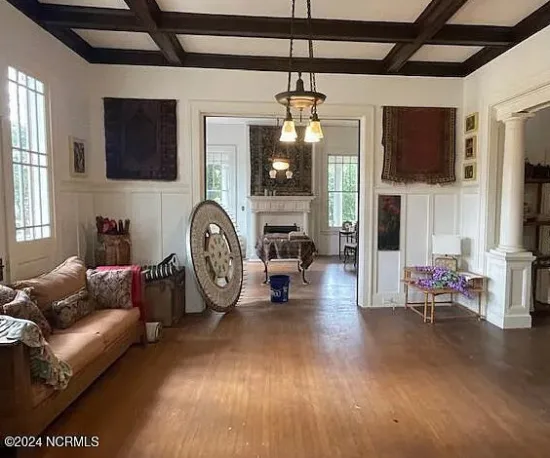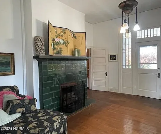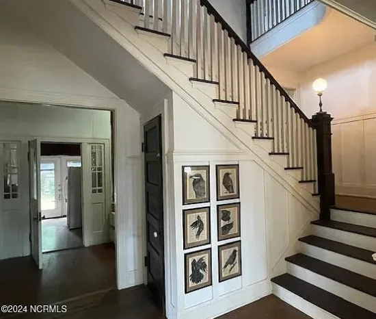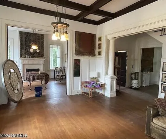 - Interior Highlights: Grand staircase, coffered ceilings, wainscoting, vintage light fixtures, original wood floors, tall ceilings, double pile center hall plan.