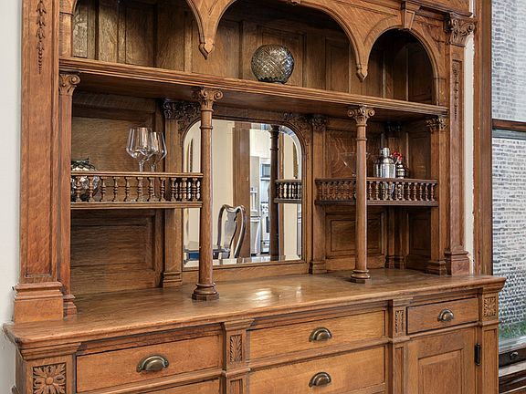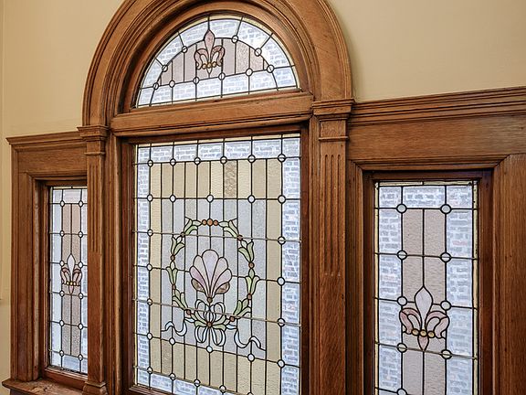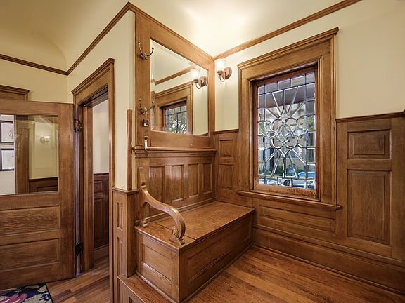 As you step through the original front door, the grand foyer opens before you, setting the tone for the rest of the home. A large mirrored double closet provides both functionality and elegance, while exquisite original quarter-sawn oak millwork lines the walls, reflecting the craftsmanship of a bygone era. At the center of the foyer, a grand staircase rises gracefully, complete with a built-in bench and mirror, creating a sense of arrival that is simply unmatched in modern construction. One of the most striking features, an original stained-glass window, bathes the space in filtered light, highlighting the warm tones of the wood and the intricate details of the design. These historical elements are not just decorative; they are a testament to the enduring artistry that defines this extraordinary home.