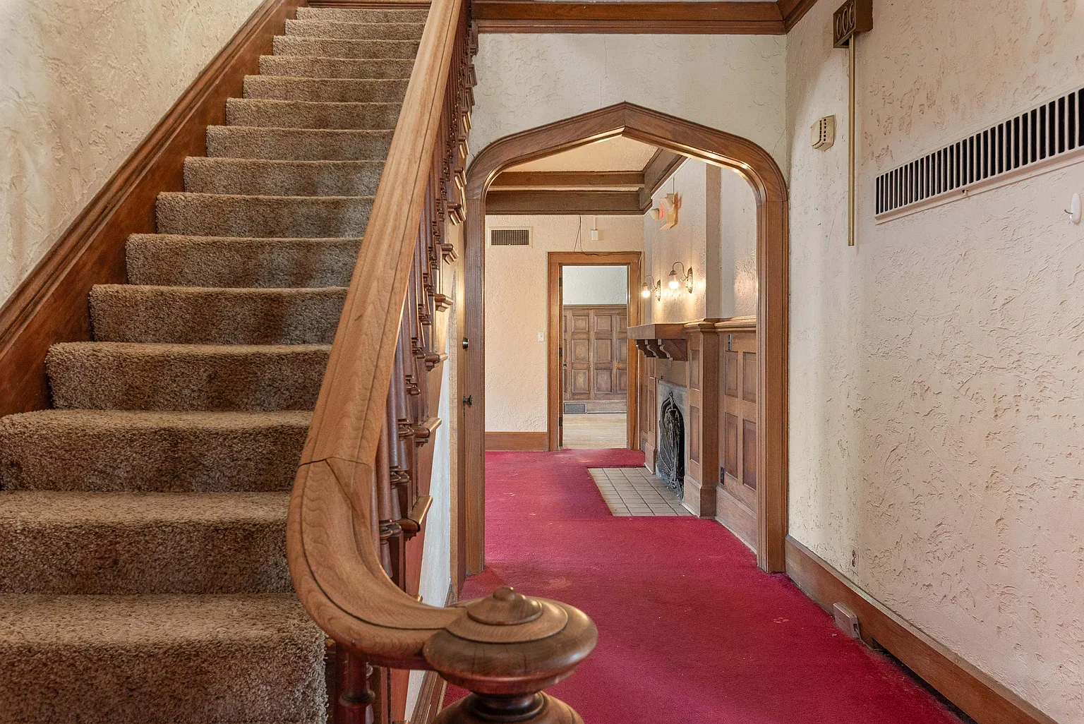 One of the most striking interior features is the dramatic oak staircase. Anchoring the main level, it serves as both a functional element and a visual centerpiece. The craftsmanship is evident in its proportions and detailing, reflecting the care and skill of the artisans who built the home more than a century ago. Surrounding the staircase, extensive wood paneling and period millwork continue the narrative of quality and durability, reminding visitors that this house was designed to endure.