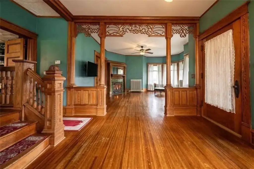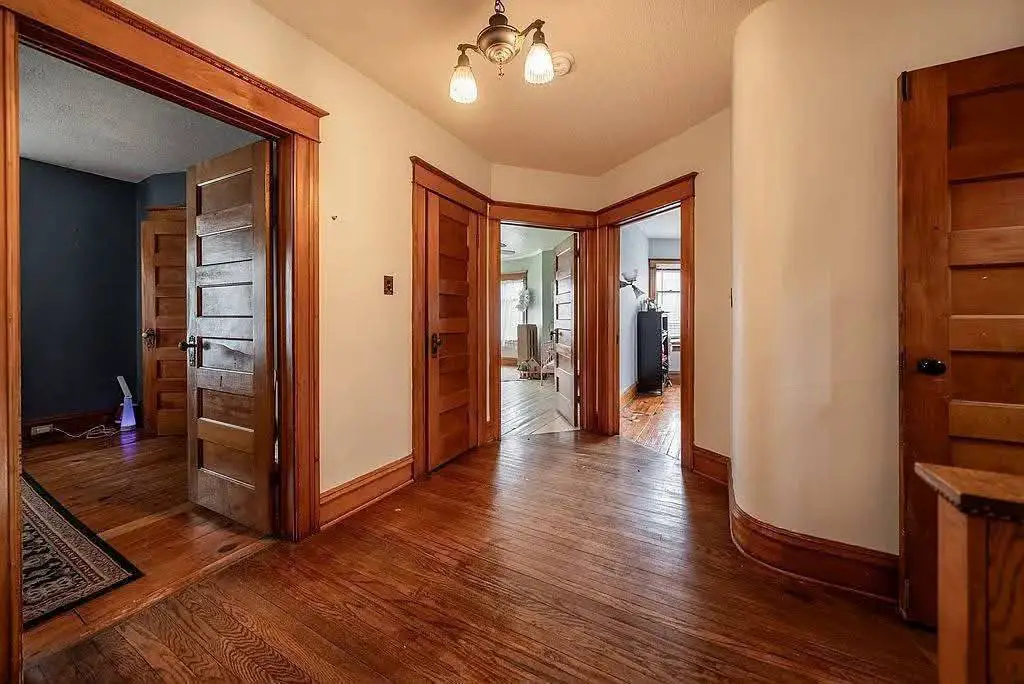Inside, the sense of charm continues. The woodwork is striking, representing a level of craftsmanship that is rarely replicated in contemporary real estate. Hardwood floors flow throughout the main level, tying each room together with a sense of continuity and warmth. While many modern homes try to recreate the look of original materials using newer products, the authenticity here is unmistakable. The details—trim work, mouldings, door frames—reflect a time when builders and artisans poured heart and skill into every inch of a house. Walking through the entryway into the first rooms, you begin to notice how effortlessly the spaces connect. Rather than the abrupt transitions you might find in homes that have been renovated without regard for original layout, this home maintains its natural and intentional flow.