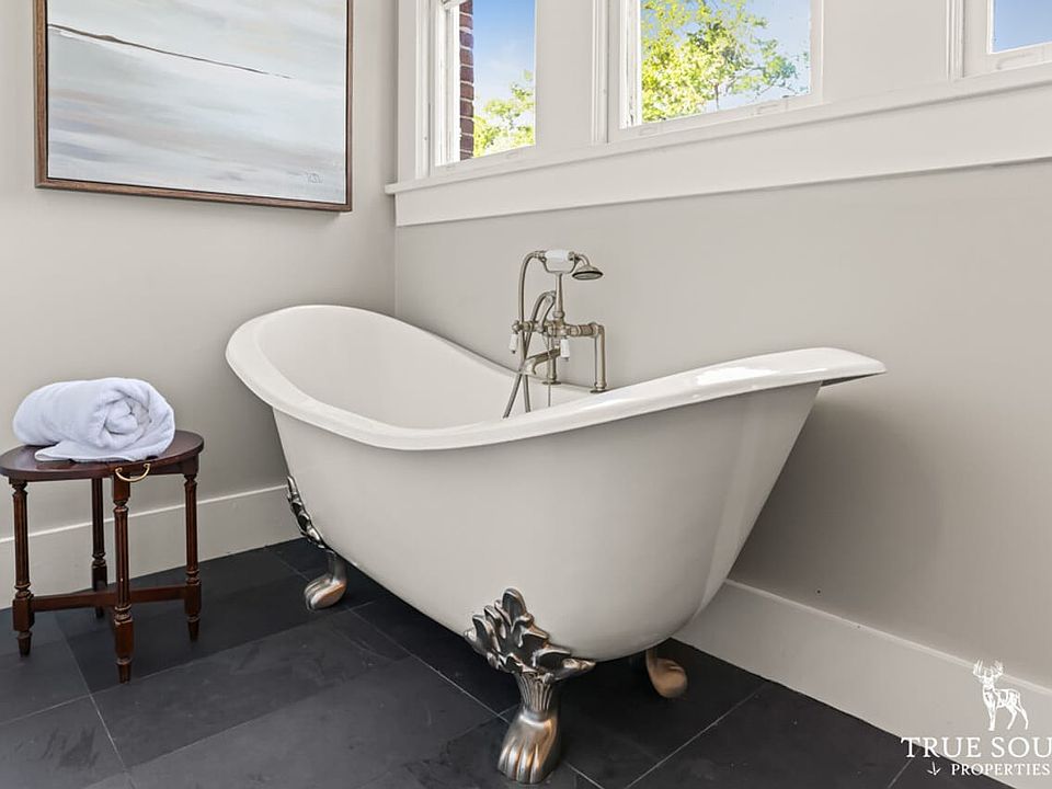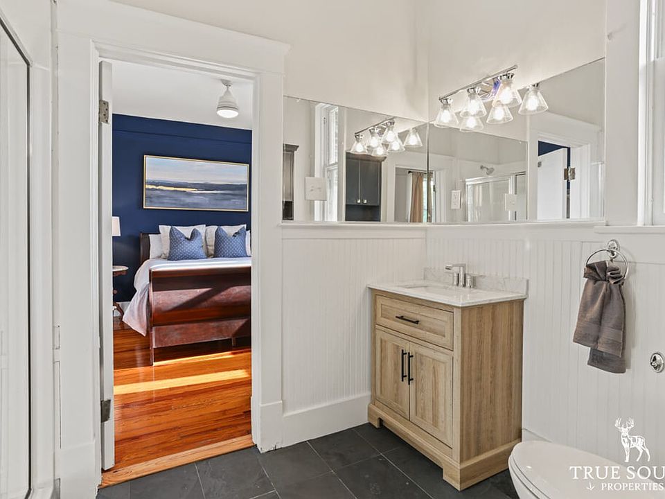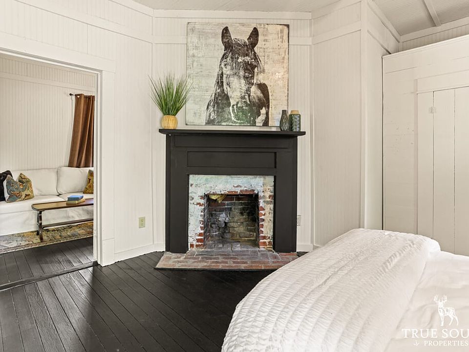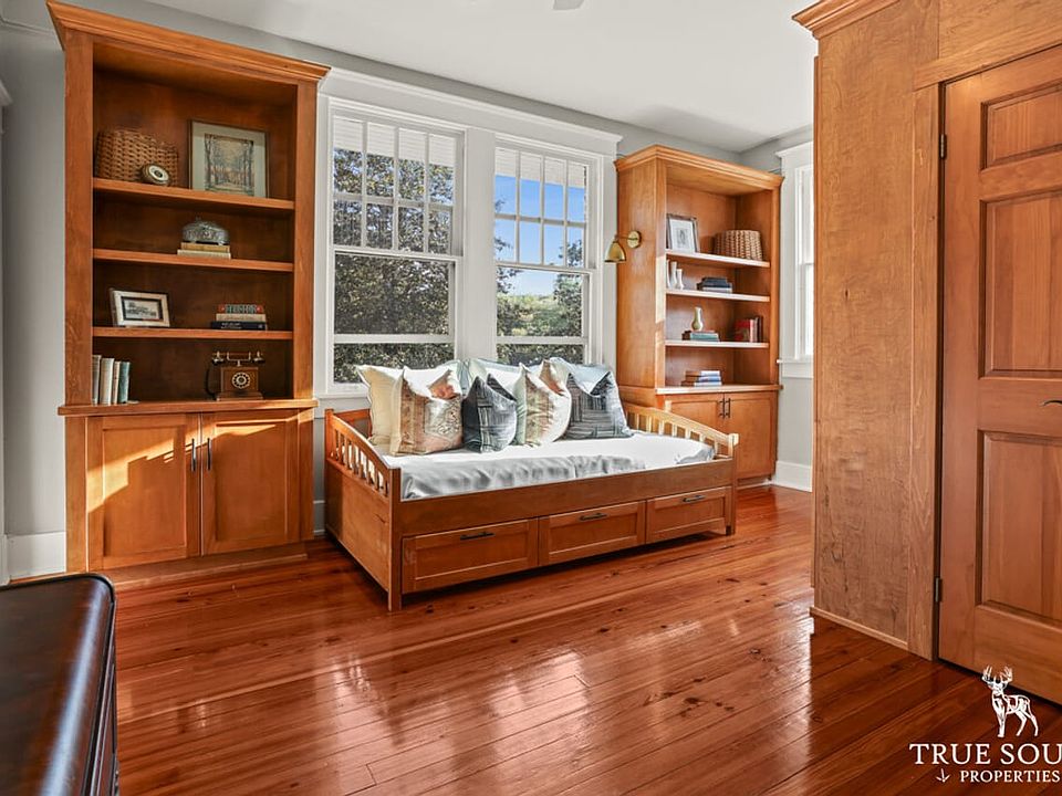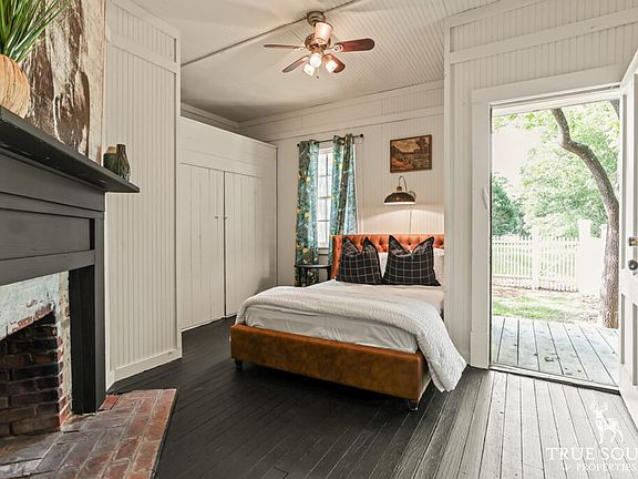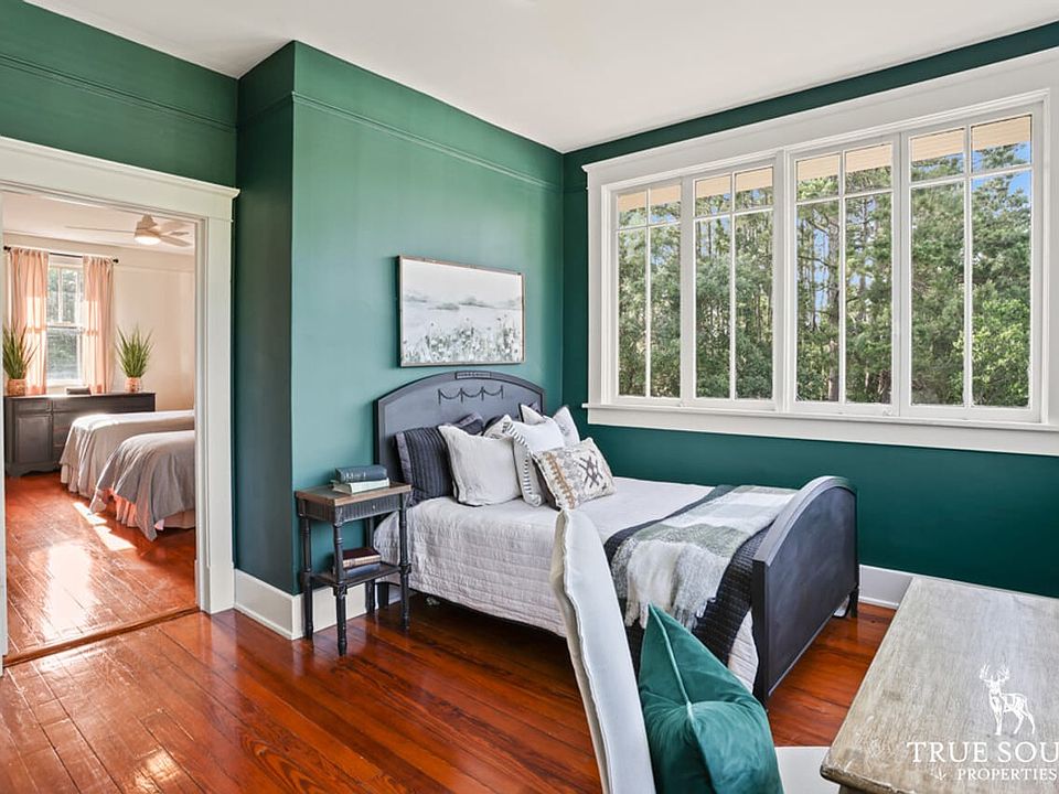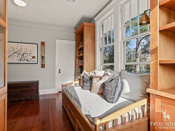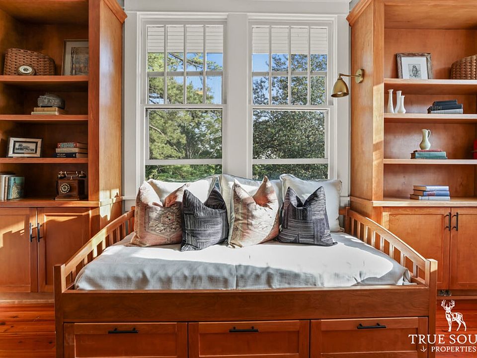 The home’s layout includes a sunlit Carolina room with wraparound windows-ideal as a reading or breakfast nook, office, or guest space-as well as spacious bedrooms with unique color palettes, designer lighting, and stunning wood flooring throughout. The bathrooms are thoughtfully updated while respecting the home’s period details.