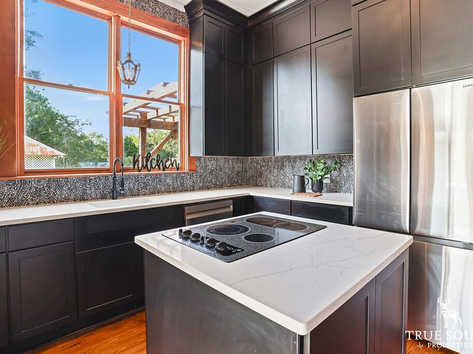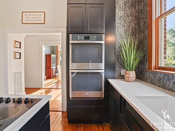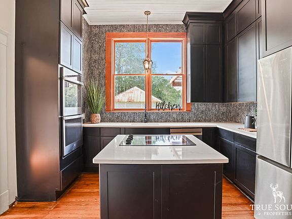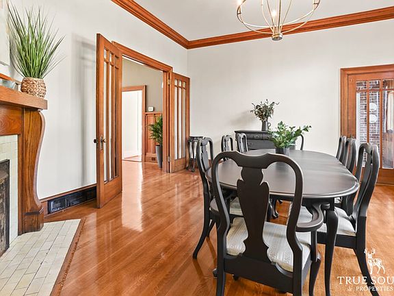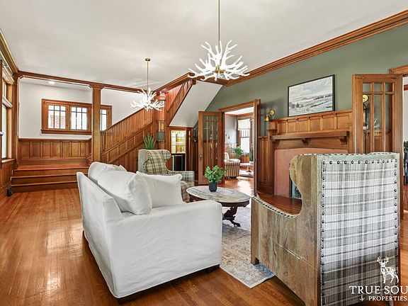 The expansive living room features rich woodwork, intricate fireplaces, and contemporary chandeliers that offer a striking contrast. The updated kitchen is a chef’s delight, boasting sleek black cabinetry, stainless steel appliances, quartz countertops, a center island cooktop, and a dramatic tile backsplash-perfectly marrying historic character with modern convenience. The spacious floor plan includes multiple living areas, second story bedrooms, and a welcoming front porch perfect for enjoying quiet evenings or morning coffee.