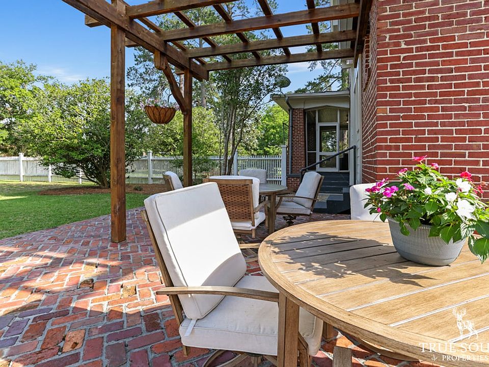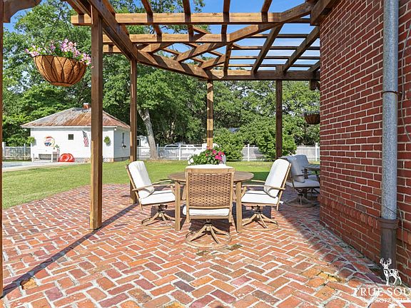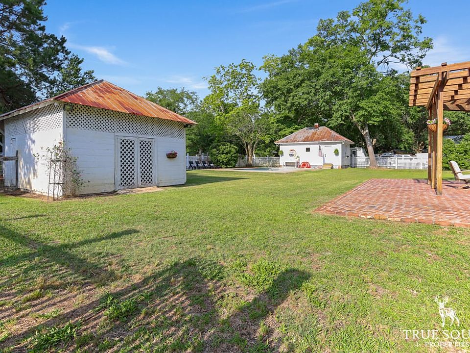 There are two additional outdoor storage buildings, one used primarily for pool equipment, the other a two-story garage that could be used as a versatile workshop or gardening storage. The immediate fenced in backyard and swimming pool area also features a large brick terrace patio with a tall custom wood pergola above. Both the side screen porch and the kitchen / mud room have exterior doors that feed into this private and cozy back area.
